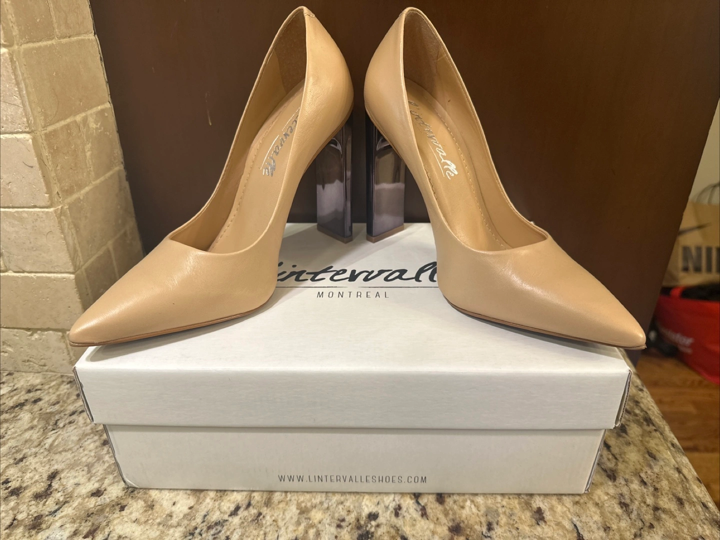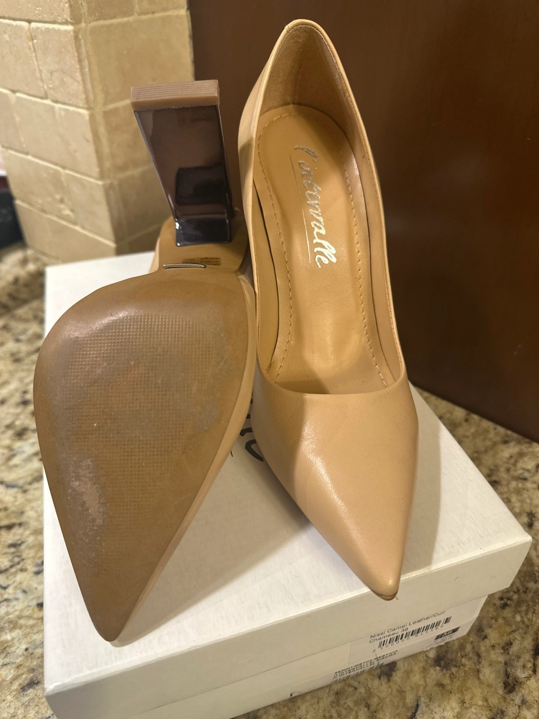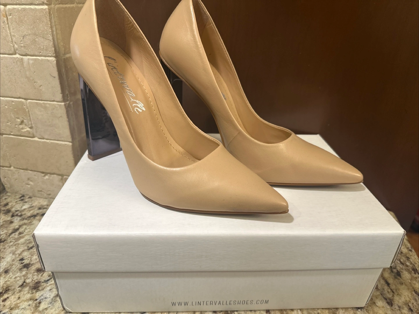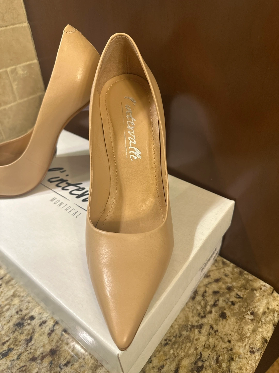 84Nude coloured, pointed-toe heels. Block heels. Leather material. Gently used. Comes in original box. Good condition.