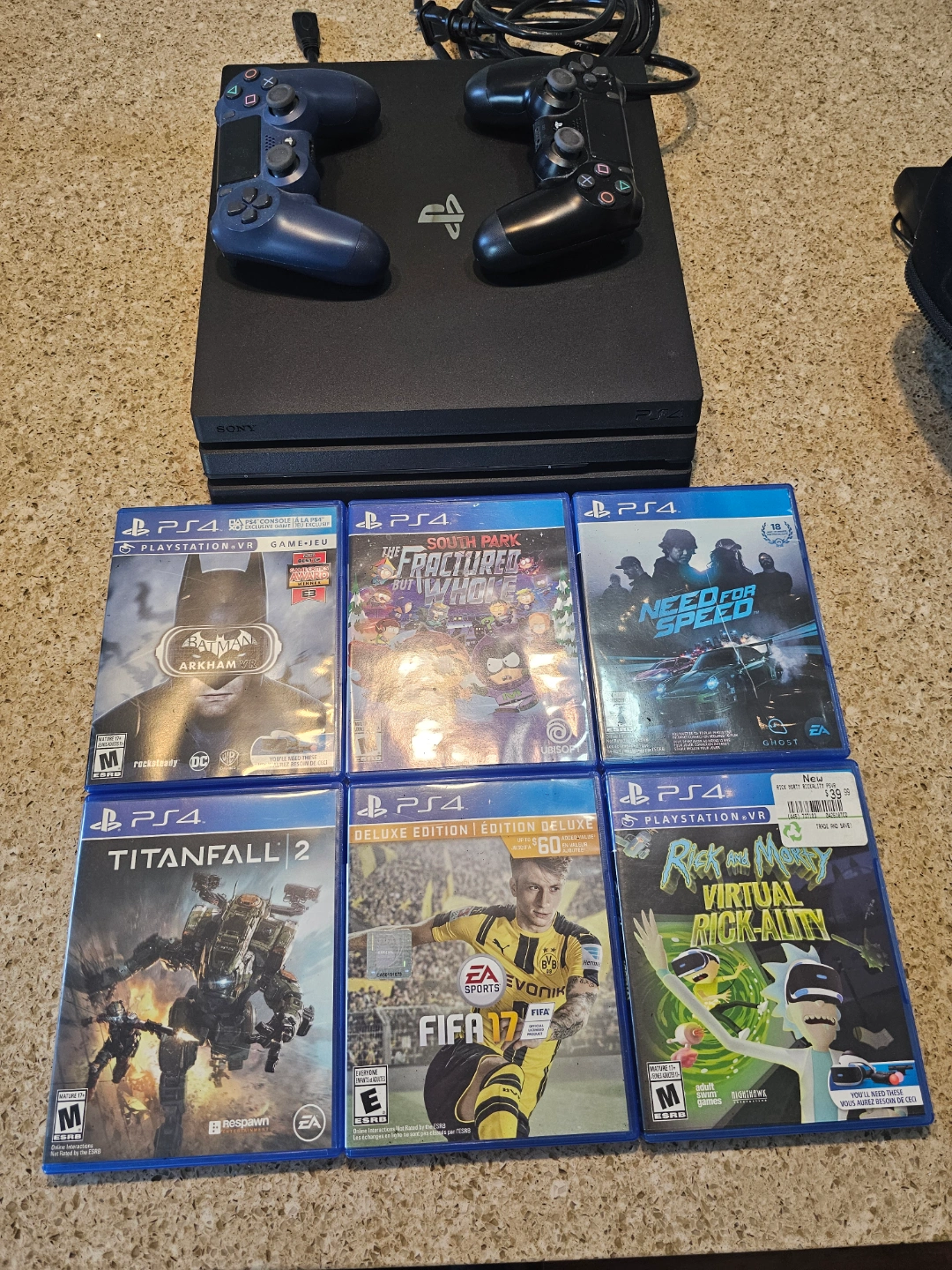 Slim PS4 console, two controllers (one blue, one black), power cable, and six games included. Games include Batman: Arkham VR, South Park: The Fractured But Whole, Need for Speed, Titanfall 2, FIFA 17, and Rick and Morty: Virtual Rick-ality.