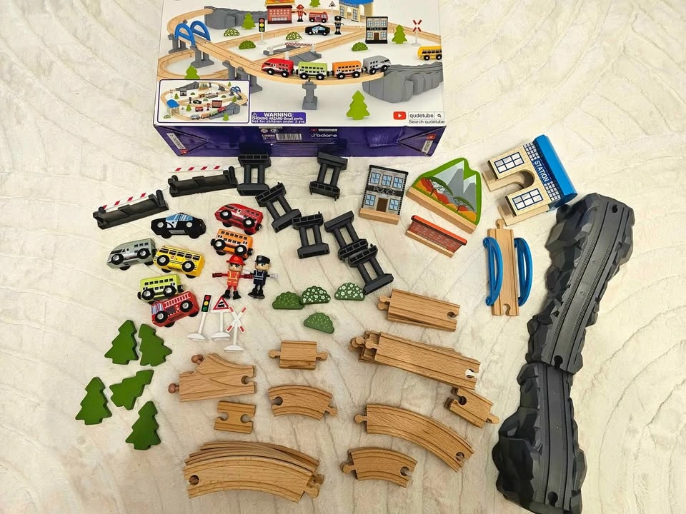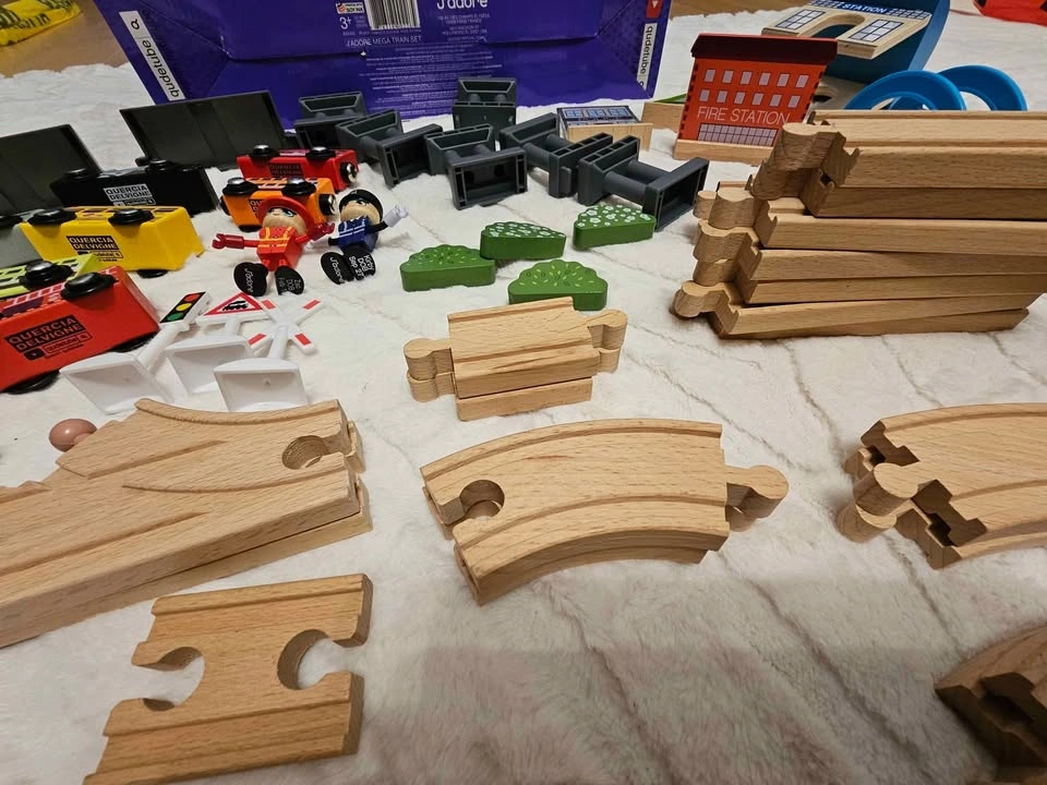 Large wooden train set. Includes tracks, trains, cars, buildings, trees, and accessories. Great for imaginative play.