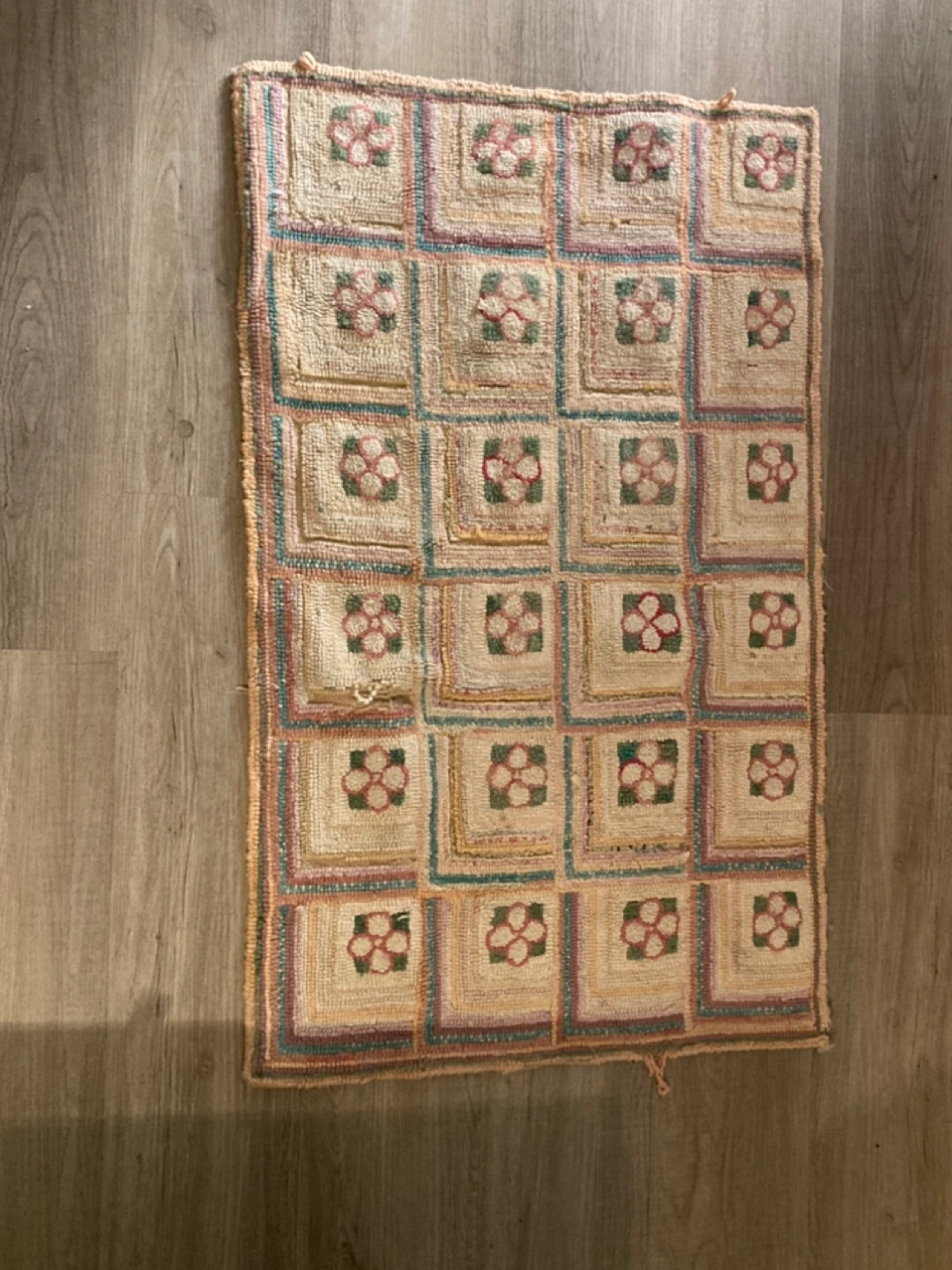 Unique handmade hooked rug. Features a repeating floral pattern. Cream, green, pink and beige colour scheme. Shows some wear but would make a great bath mat!!