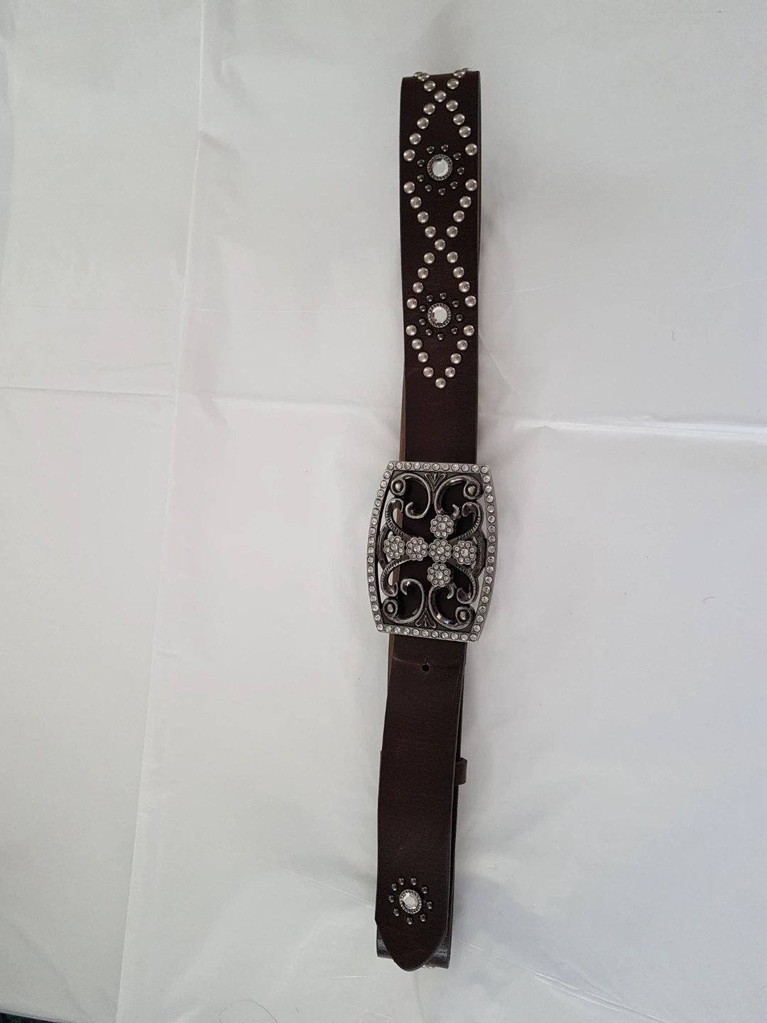 Brown leather belt. Features ornate metal buckle and rhinestone accents. Size large.Please also check out my other listings on this account. This is a no pet/ smoke home. Pick Up Cochrane, Alberta