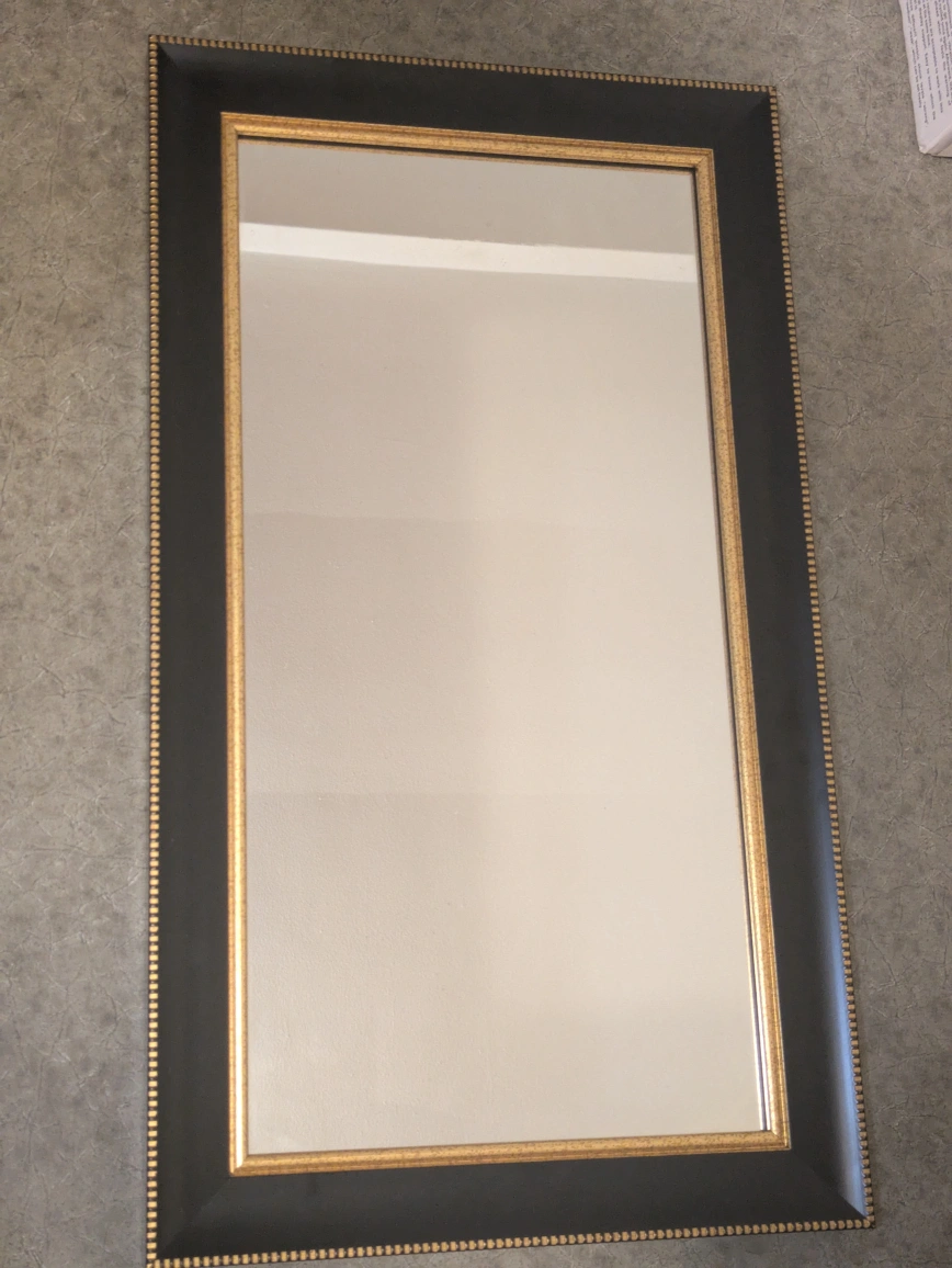 Beautiful rectangular mirror. Black frame with gold inner trim. Small decorative beads around the edge. Perfect for any room.