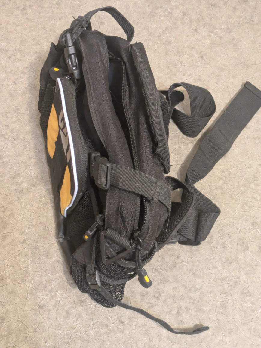 Black and yellow waist pack. Multiple pockets and compartments. Adjustable straps. Great for carrying essentials.