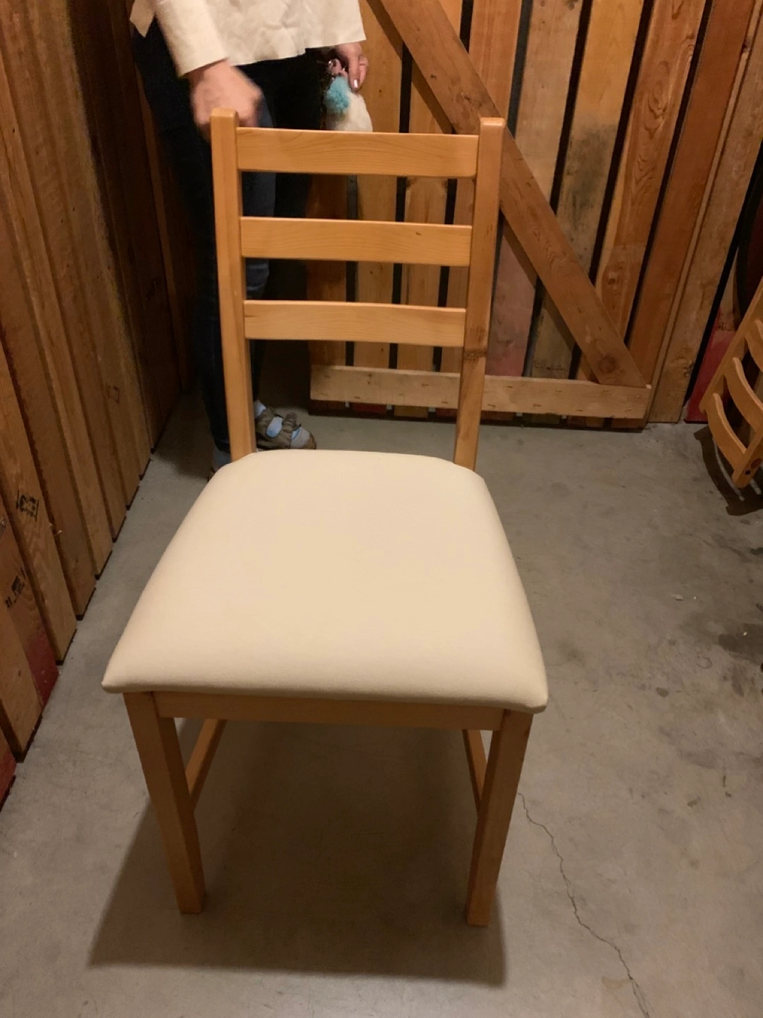 Solid wood chair. Cream coloured cushioned seat. Simple design. Good condition.