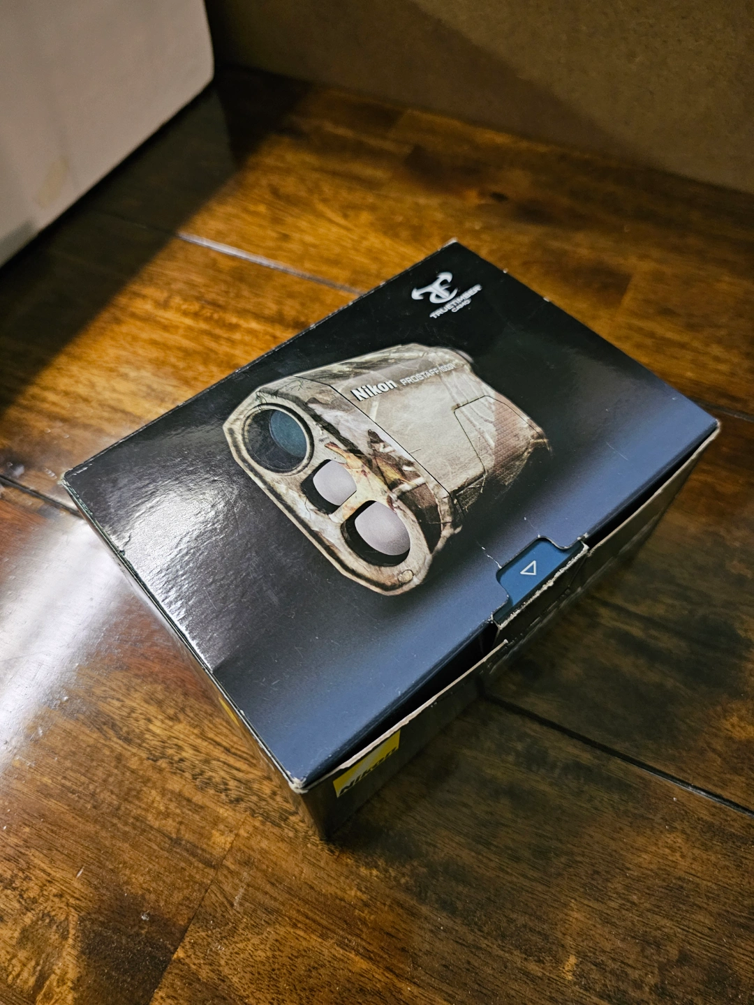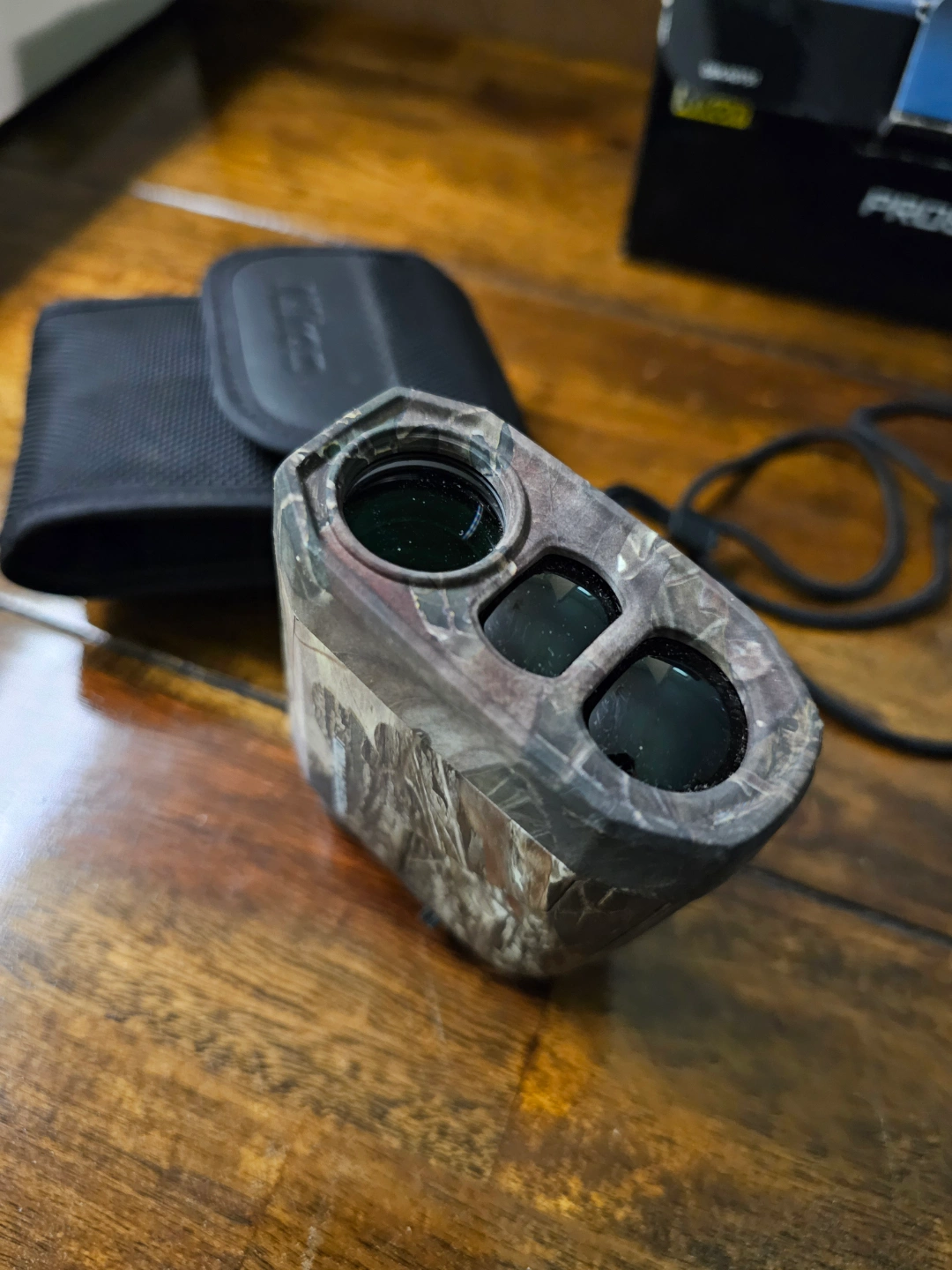Compact laser rangefinder, measures distance. Includes carrying case. Good for hunting or other outdoor activities. Camo pattern.