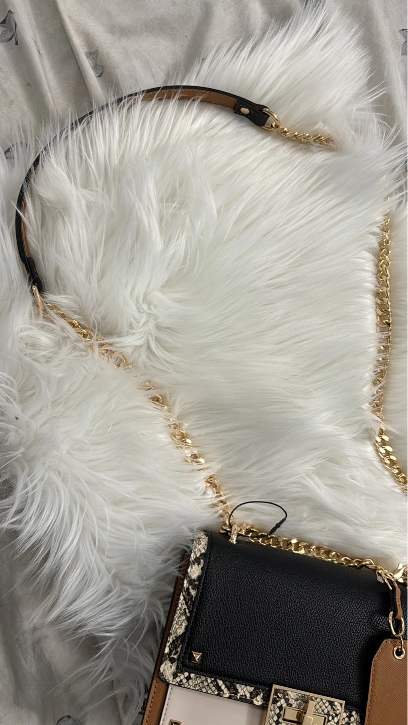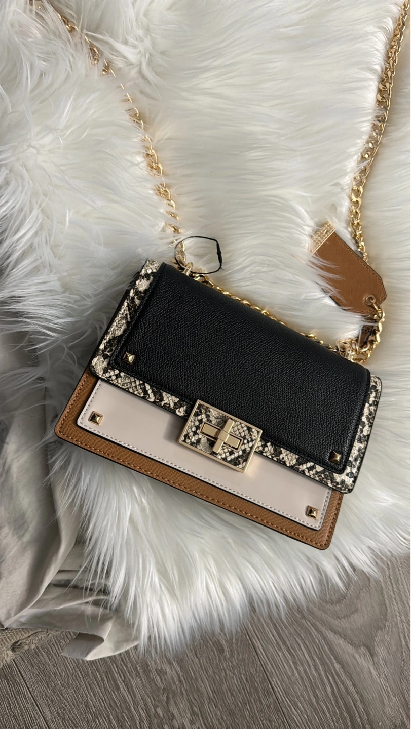 Stylish crossbody bag. Features a mix of textures and colours. Gold-toned chain strap. Snakeskin-trimmed accents. Multiple compartments. Perfect for everyday use.