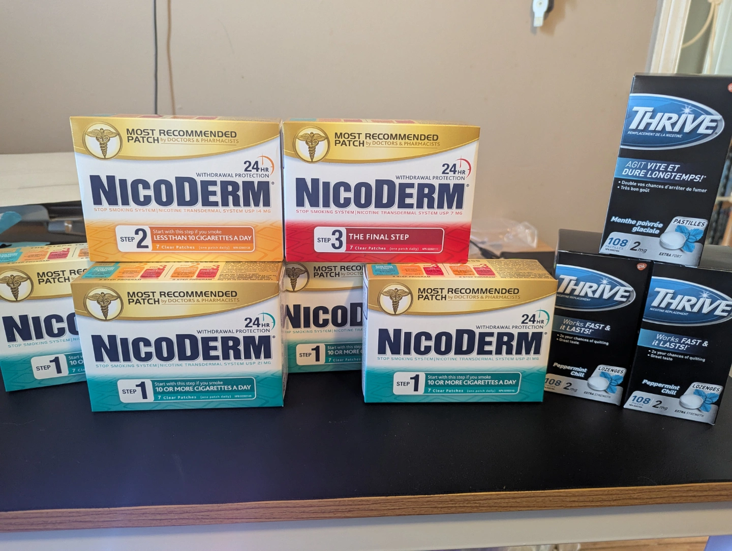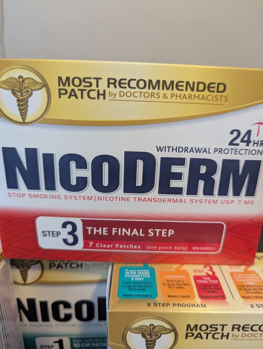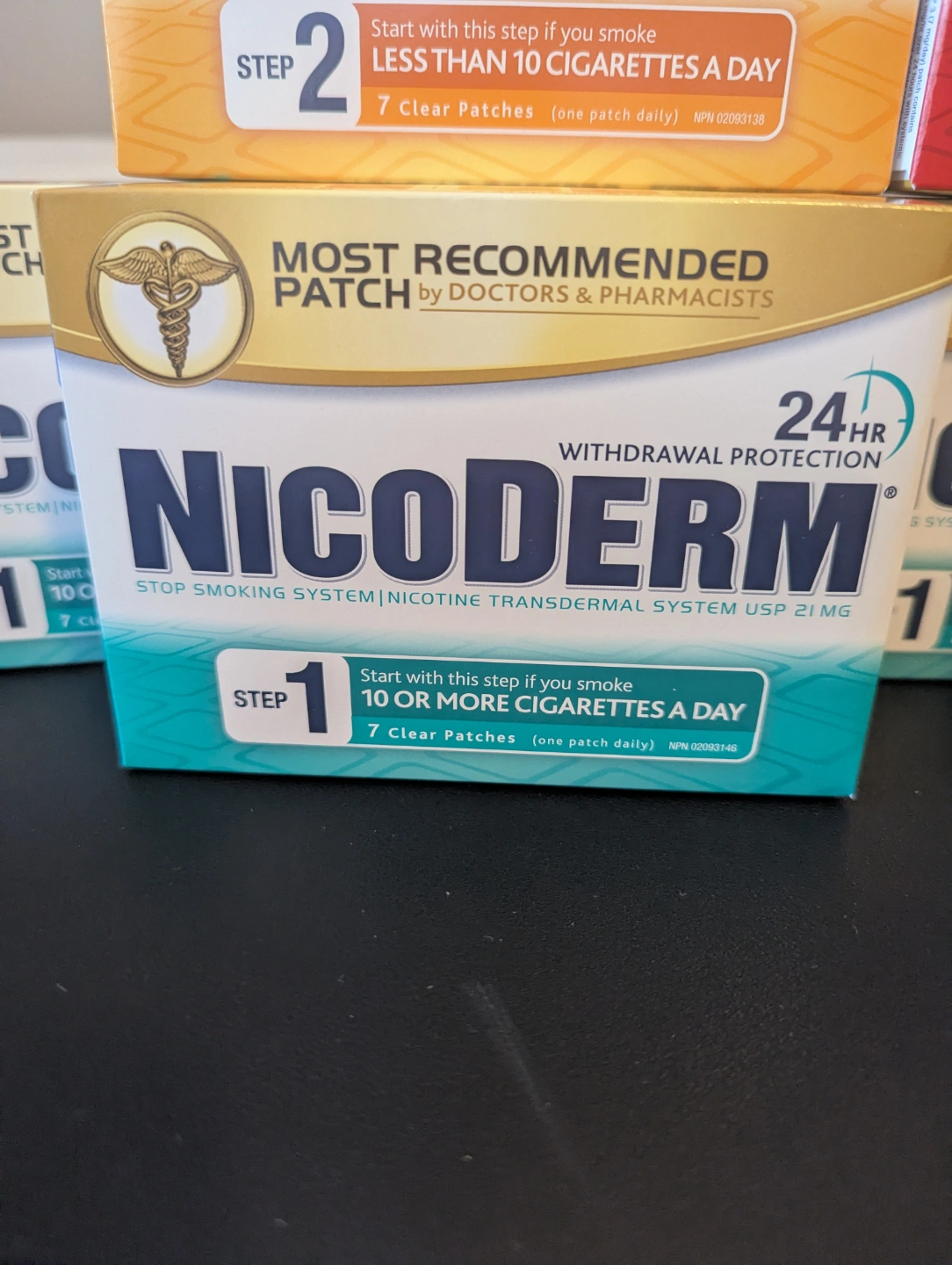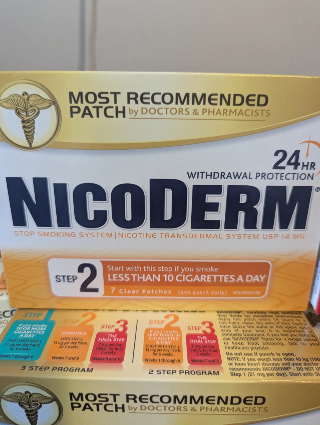 ✅ 1 box of Nicoderm Step 2 (14mg patches – for <10/day or Step 1 follow-up)