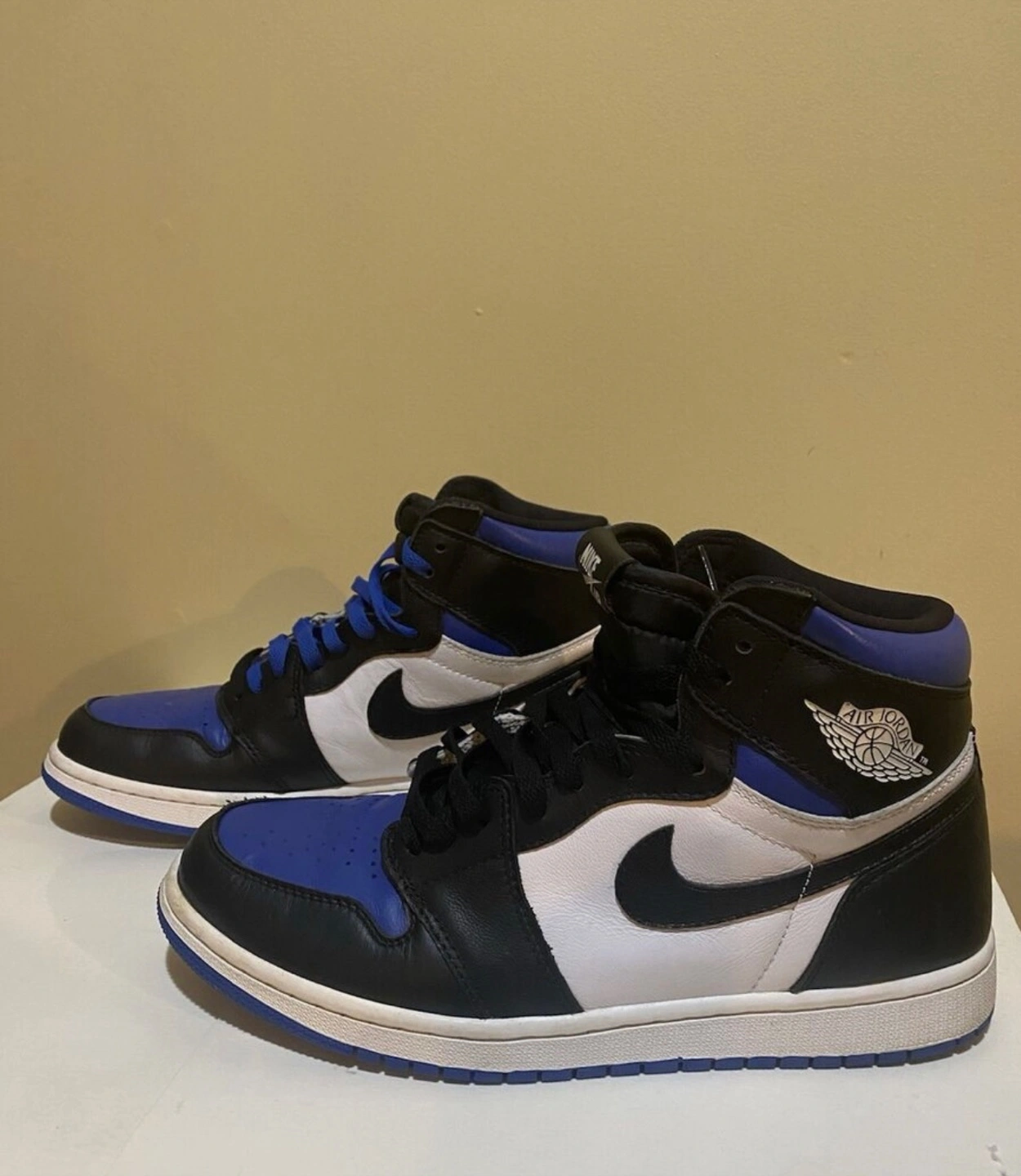 Men's high-top sneakers. Black and royal blue leather upper. White midsole. Blue outsole. Royal blue laces. Nike Air branding.