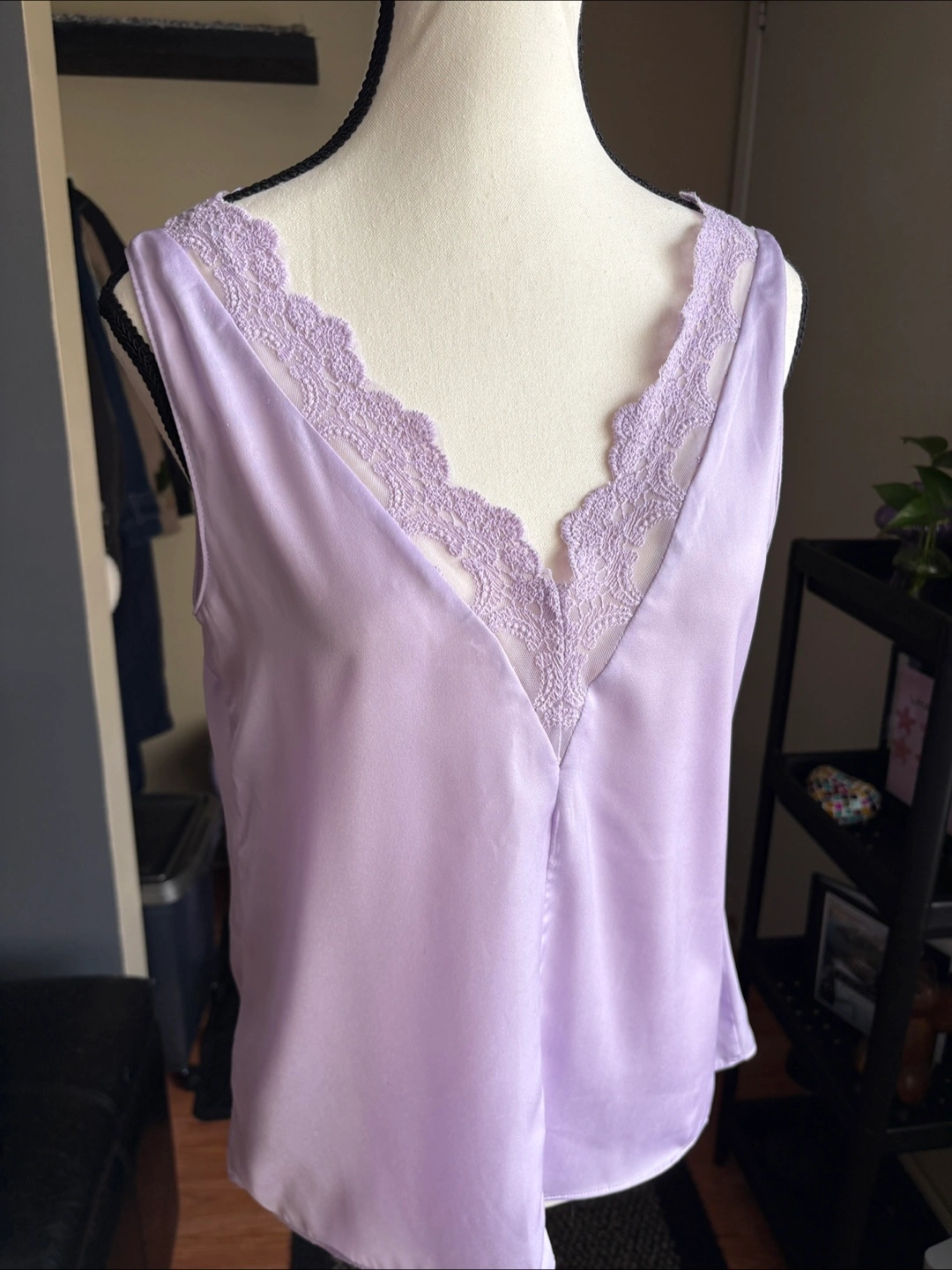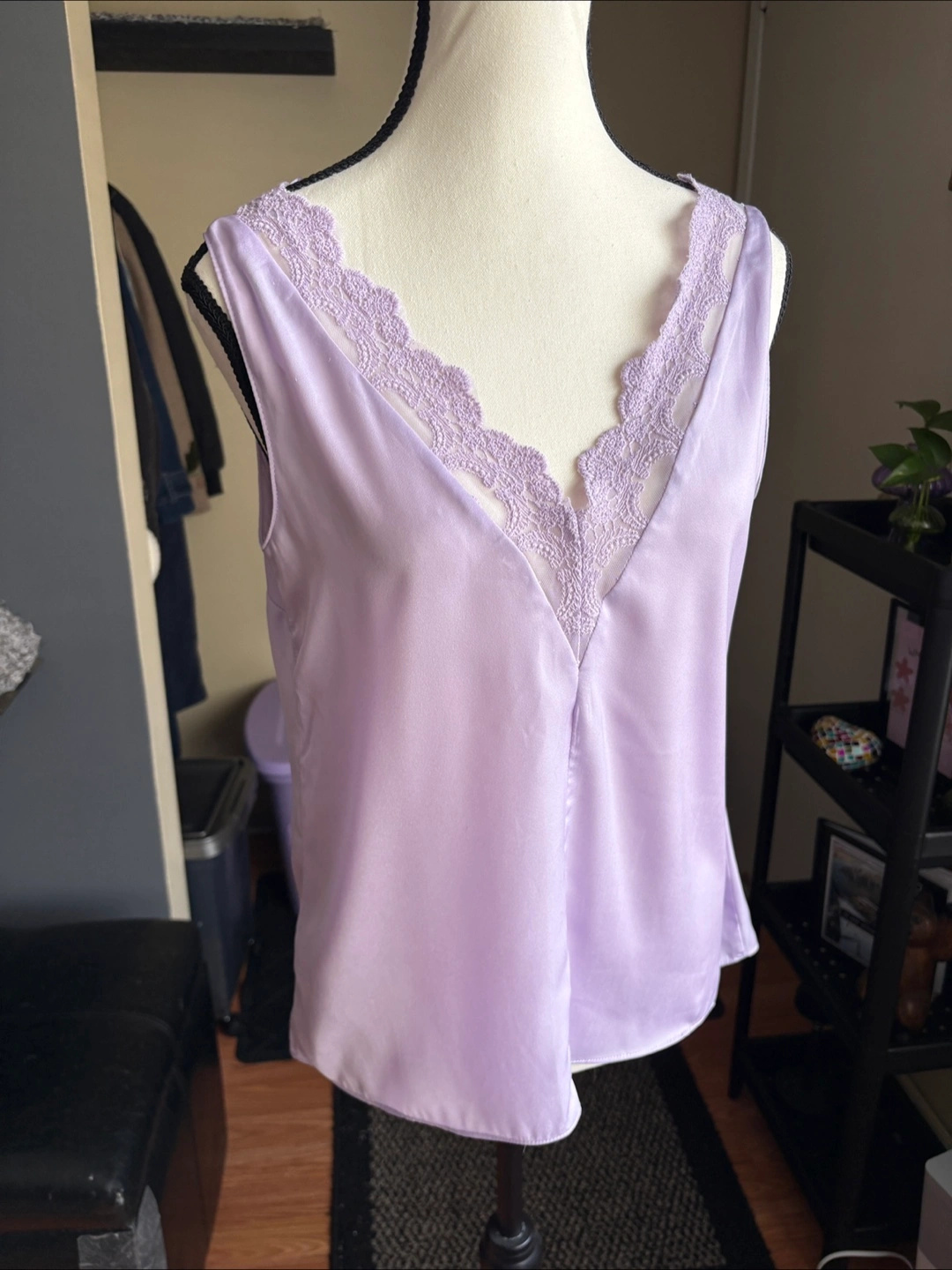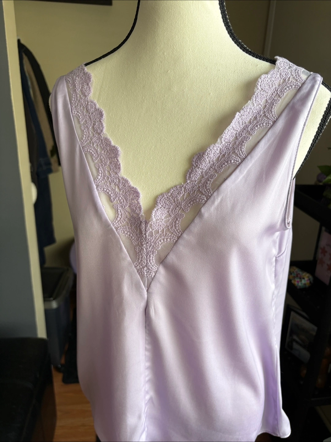 Lightweight lavender satin cami. Features delicate lace detailing at the neckline. Sleeveless, v-neck. Relaxed fit. 100% Polyester