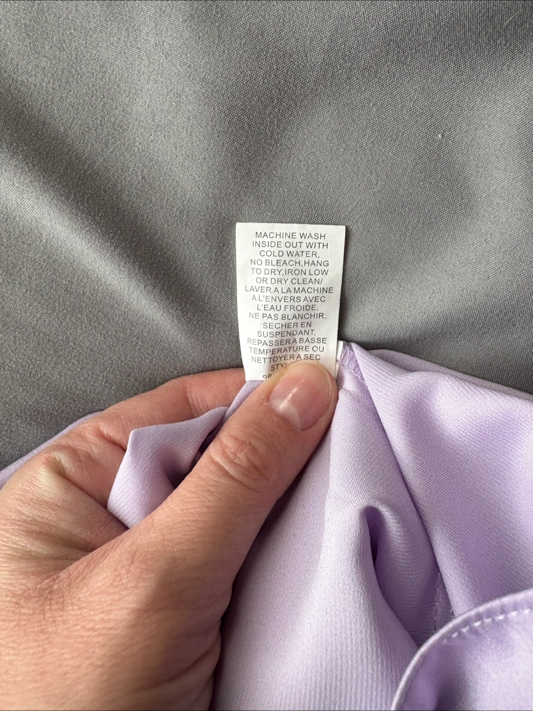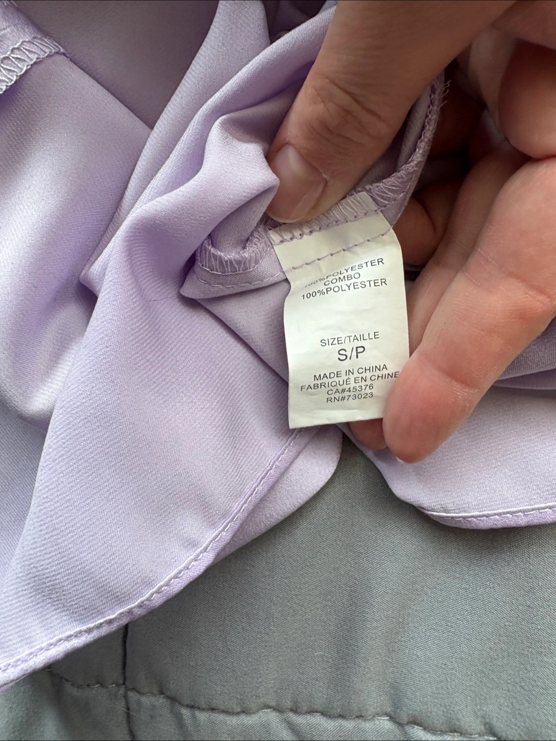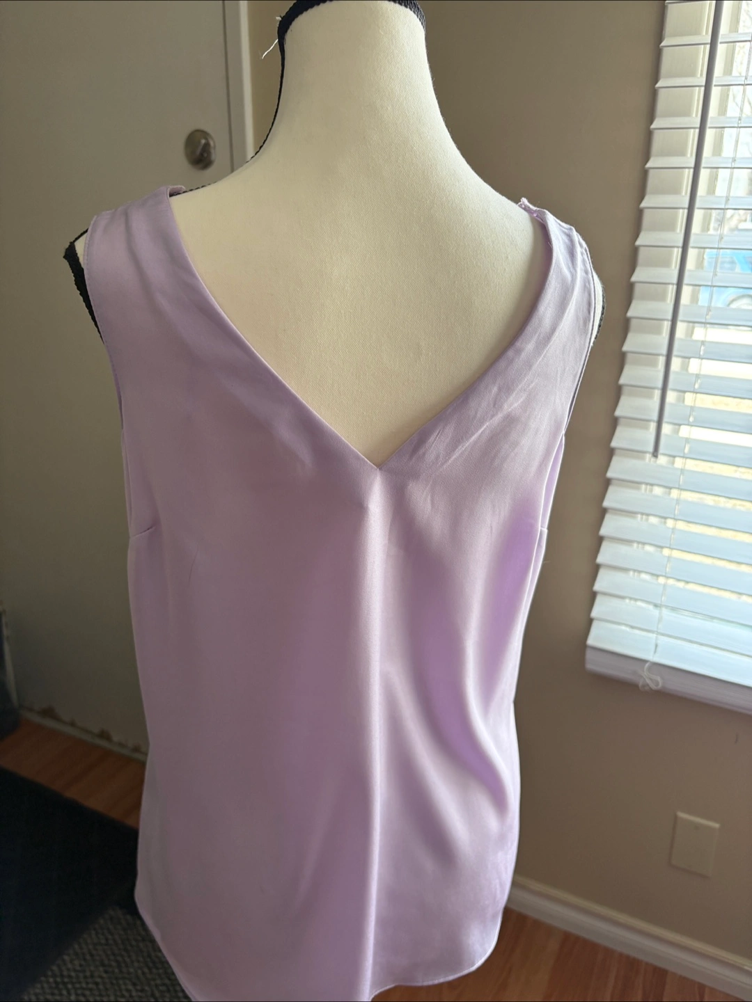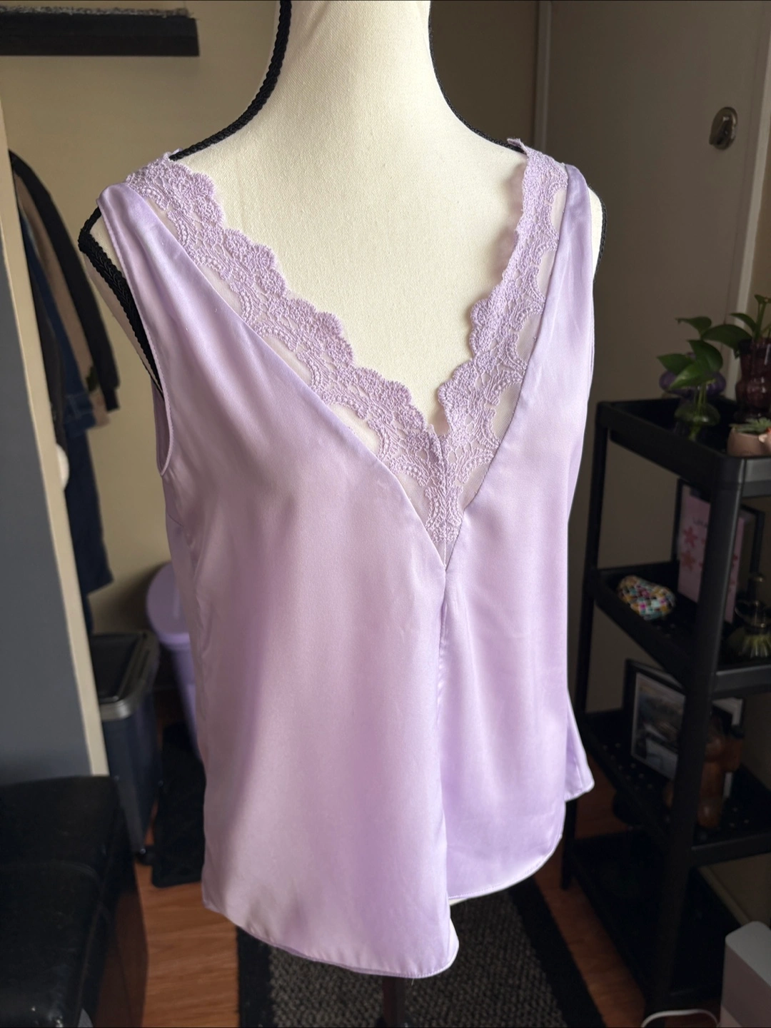 Lightweight lavender satin cami. Features delicate lace detailing at the neckline. Sleeveless, v-neck. Relaxed fit. 100% Polyester