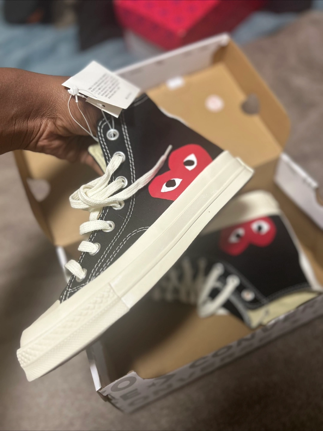 Brand new, never worn. Size 7 women's/ 5 men’s. Black canvas with signature Comme des Garçons heart logo. Comes in original box.