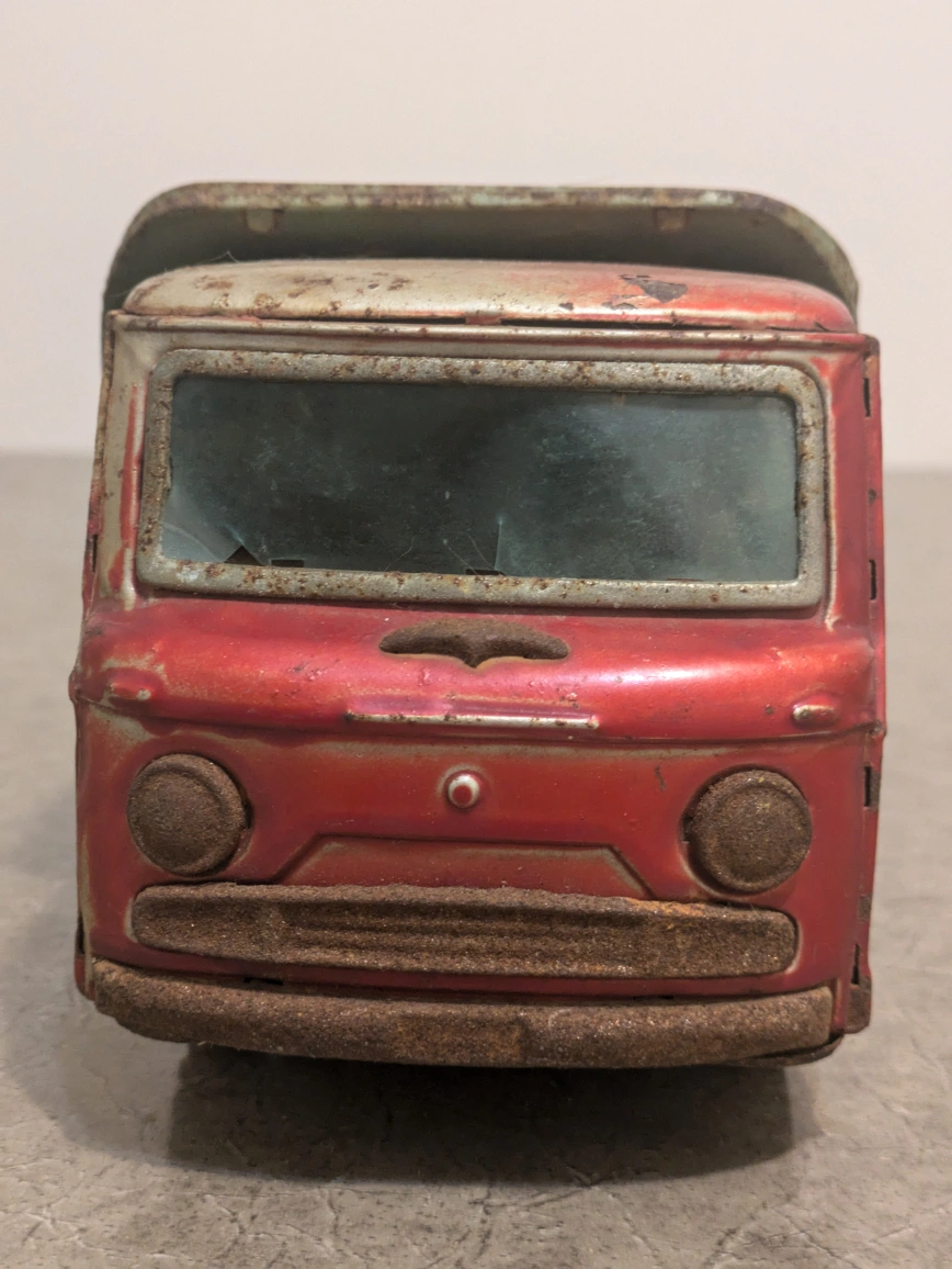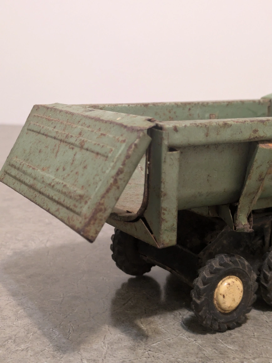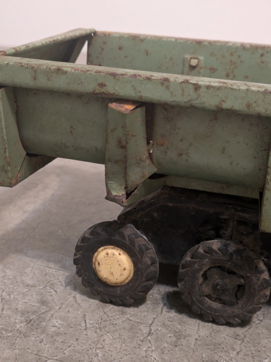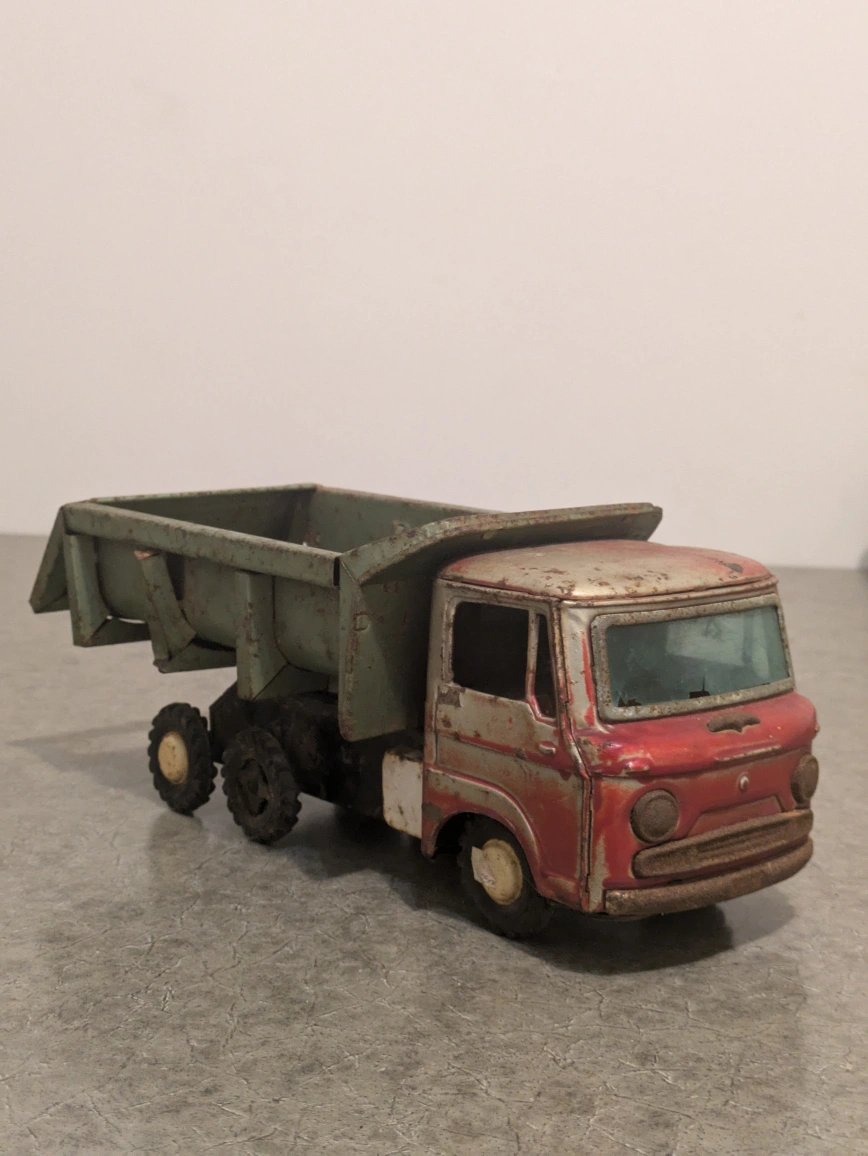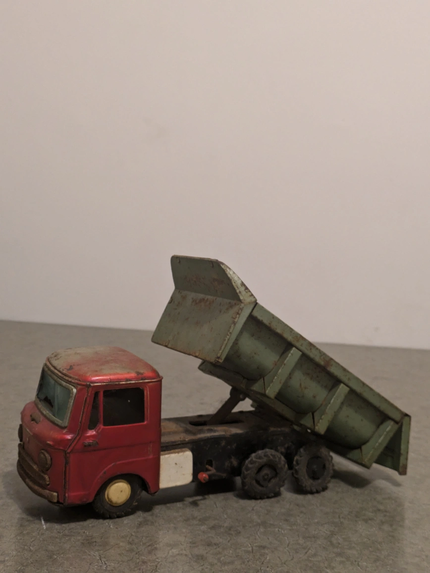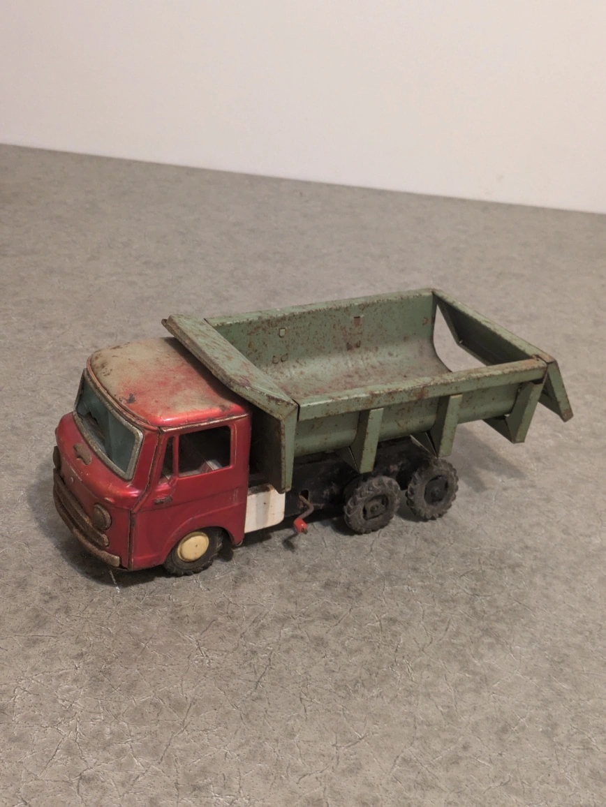 Vintage tin toy dump truck. Red cab, green bin. Shows wear from age and play. Great for collectors or enthusiasts. Wheels roll.