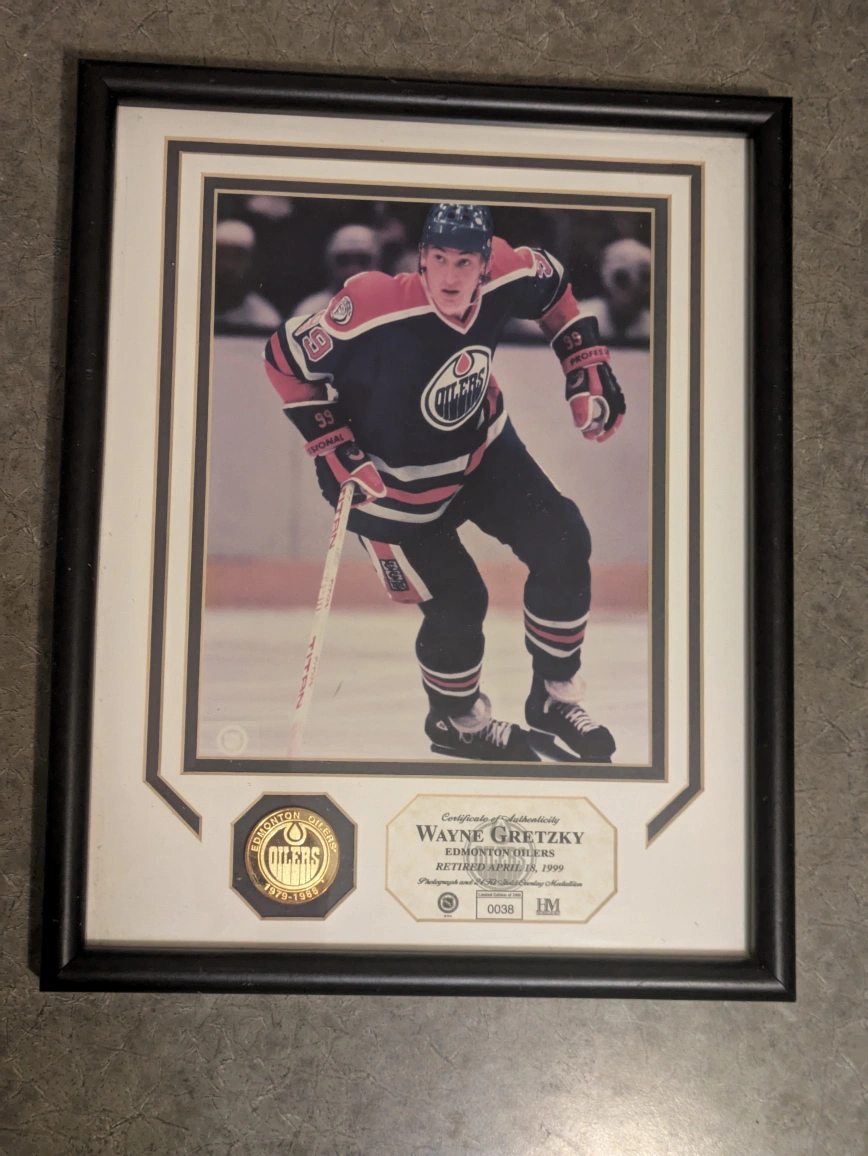 Framed photo of Wayne Gretzky playing for the Edmonton Oilers. Includes certificate of authenticity. Limited edition.