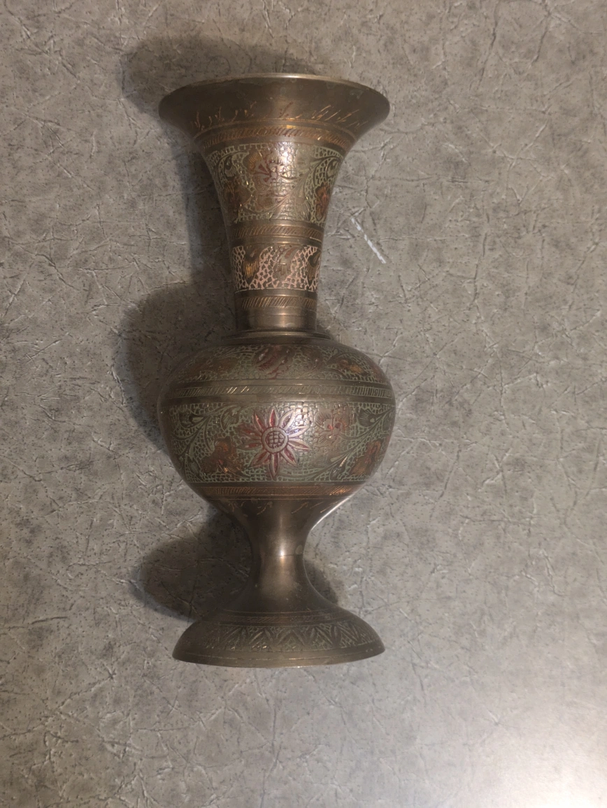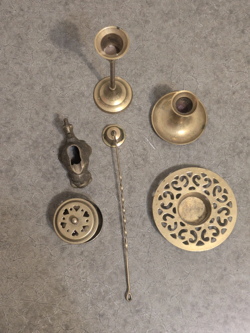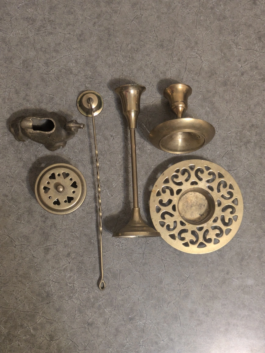 Collection of vintage brass items. Includes a camel-shaped ashtray, an ornate vase, two candlesticks, a small brass lidded container, a decorative brass plate, and a twisted brass stick. Show some character and add a touch of vintage flair to your home decor.