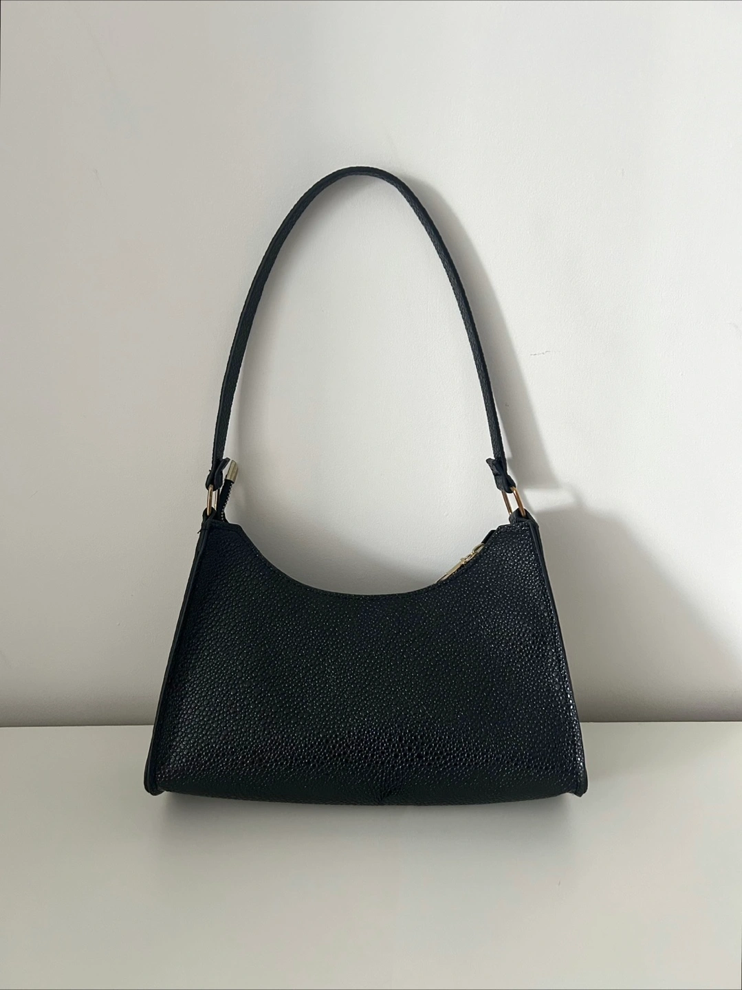 Small black shoulder bag. Features a top zipper closure and single top handle. Grained texture material. Very light!