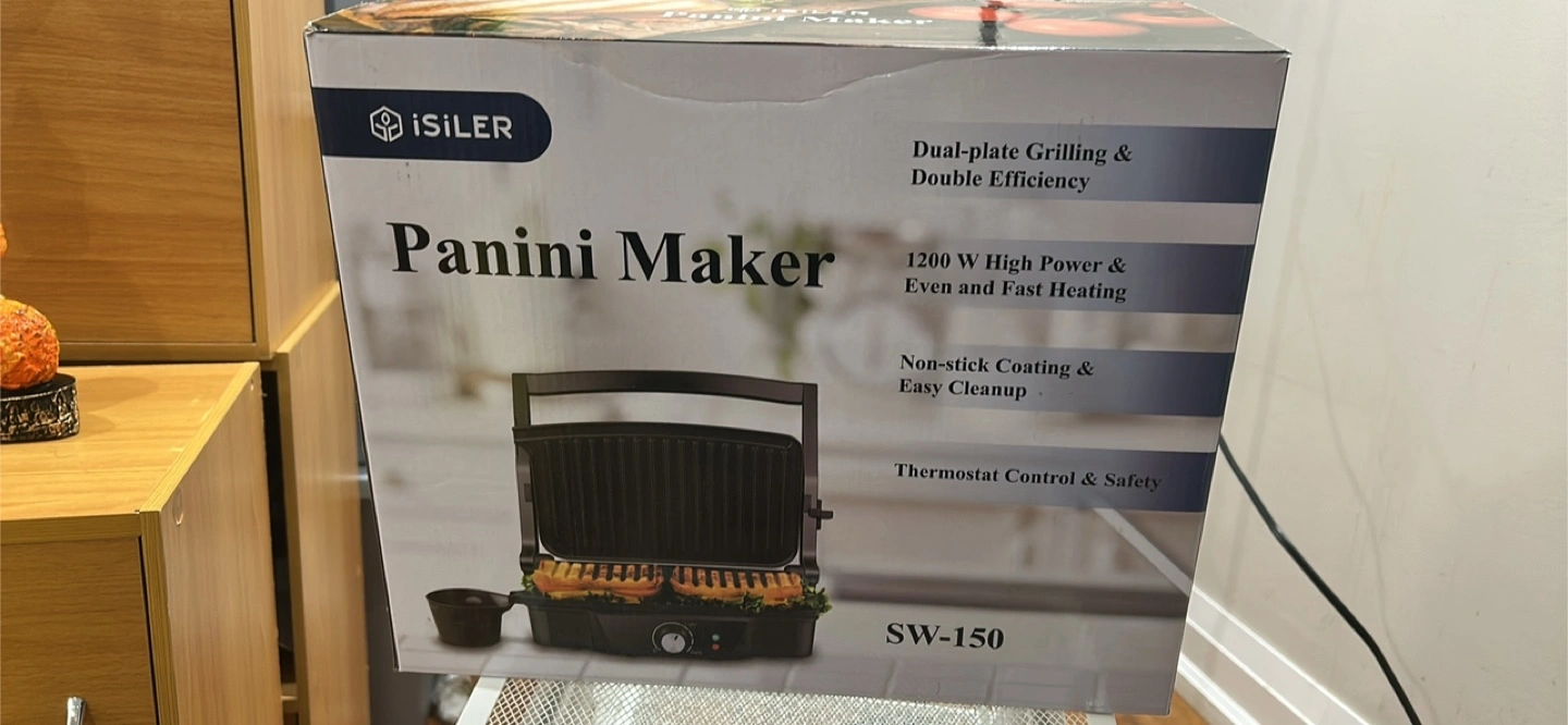 Brand new ISILER panini maker. Model SW-150. 1200W high power. Dual-plate grilling. Non-stick coating. Easy cleanup. Thermostat control.