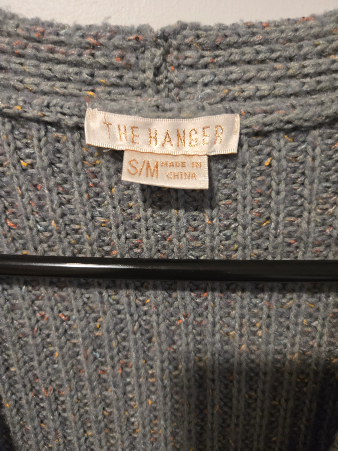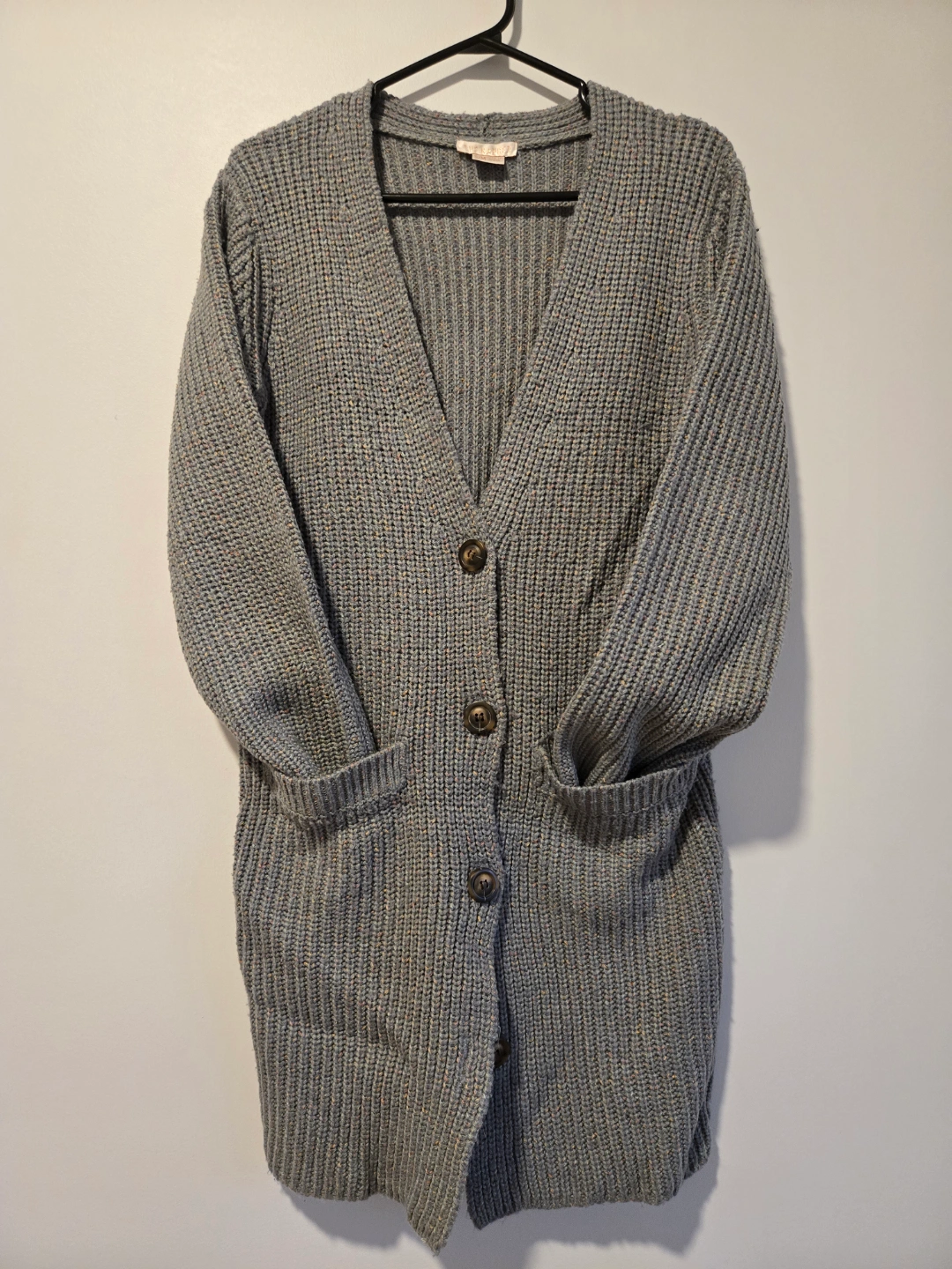 55Long sleeve button-up cardigan. Grey with colourful speckles. Ribbed knit. Two pockets. Size small/medium. pick up in langley