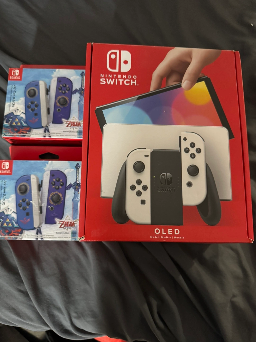 Nintendo Switch OLED console. Includes two Zelda themed Joy-Cons. in box. Come with a case.