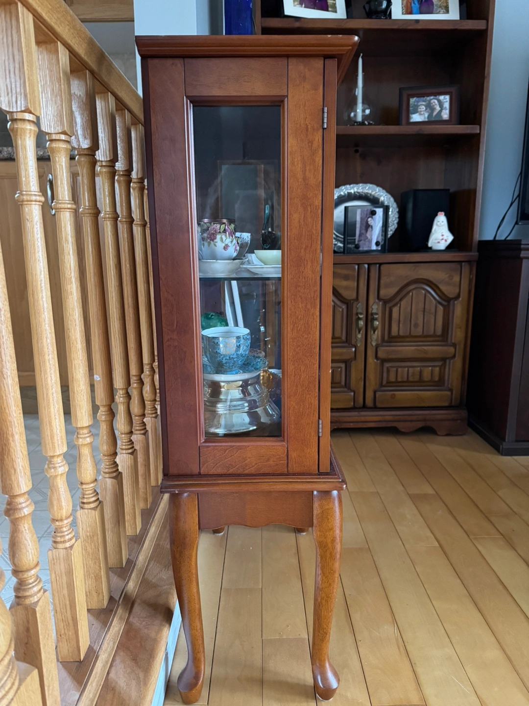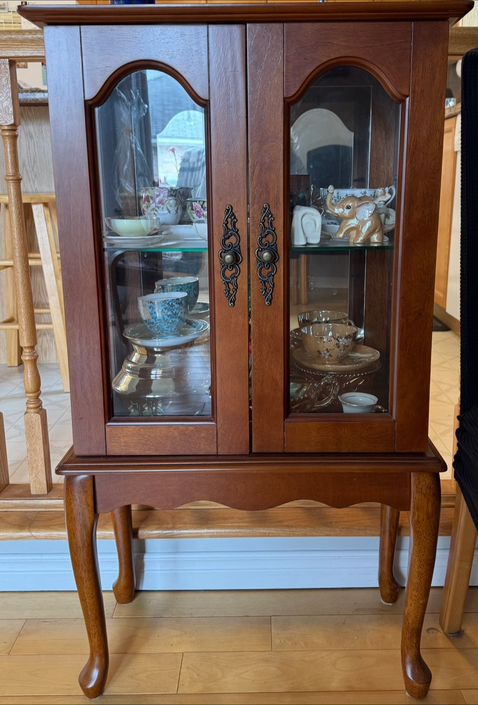 Small wooden curio cabinet. Two glass doors. Four cabriole legs. Ideal for displaying collectibles. Excellent condition.
