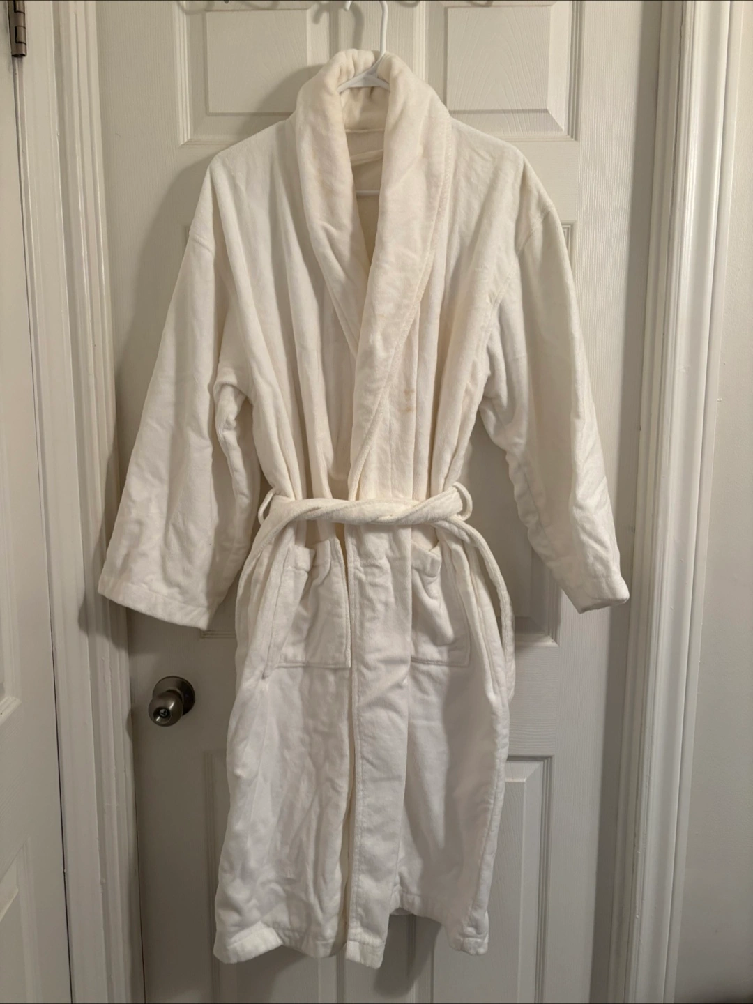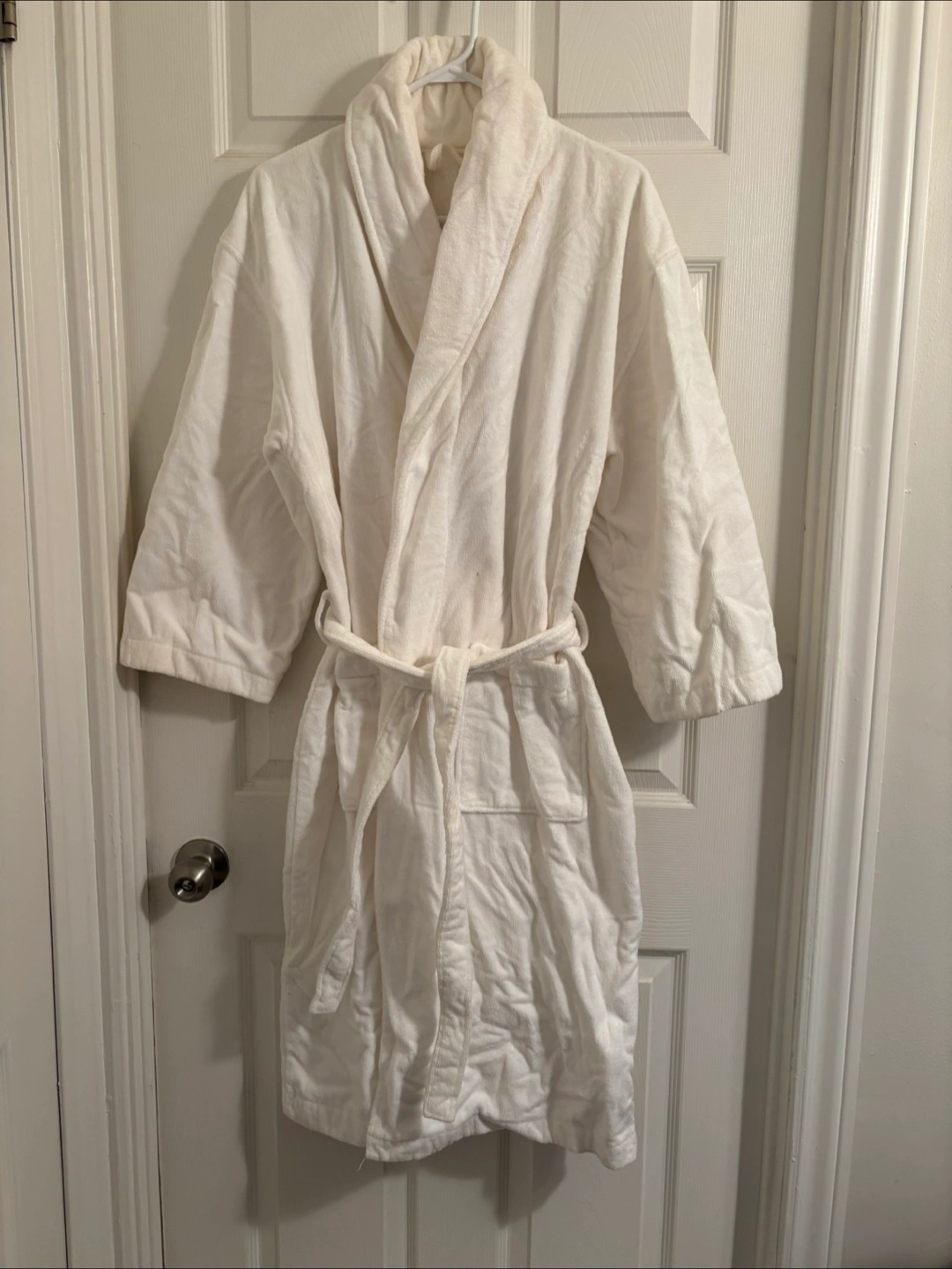 Soft, cozy bathrobe. White cloth material. Features a shawl collar, self-tie belt, and pockets. The big one has small stains that can be removed.