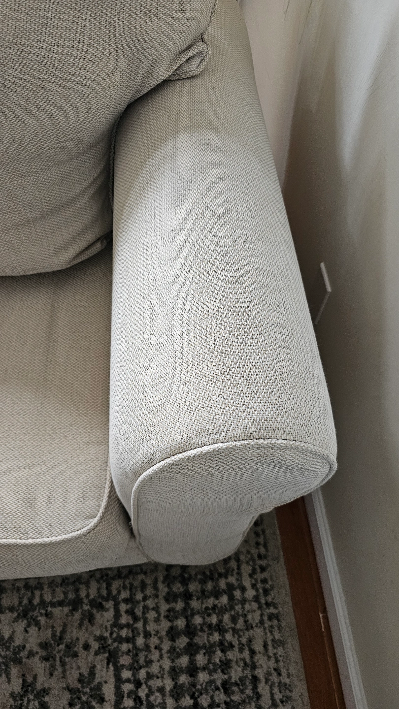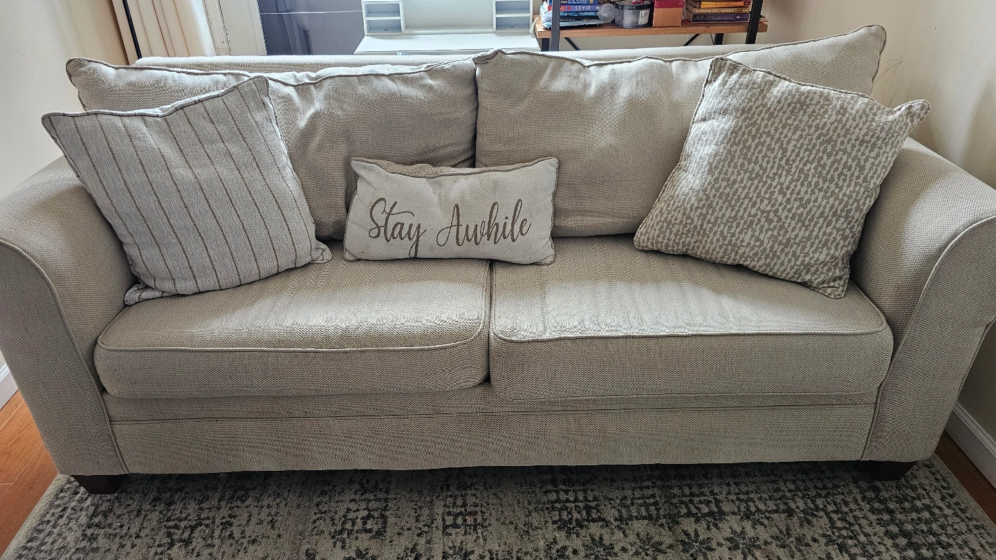 365Comfortable neutral-colored sofa. Features rolled arms and a light beige fabric. Includes three throw pillows.Machine washable removable cover. it's so comfortable Laurel Beige 85'' Sofa 85"W x 37"D x 39"H