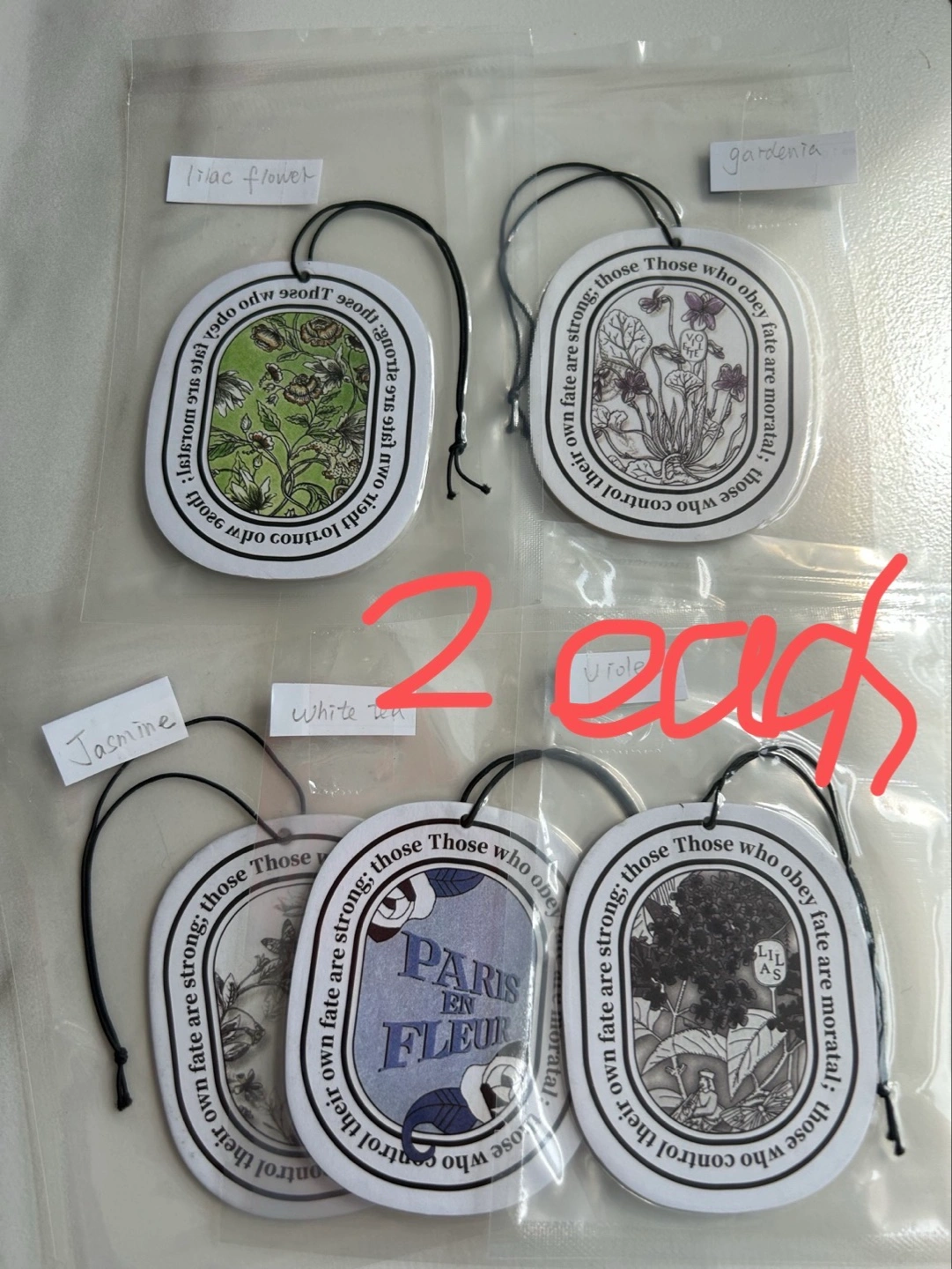 122Four oval-shaped car air fresheners. Scented options include lilac flower, gardenia, jasmine, white tea, and violet. Each features a unique floral design and inspirational quote. one set have 5 , 2$ each