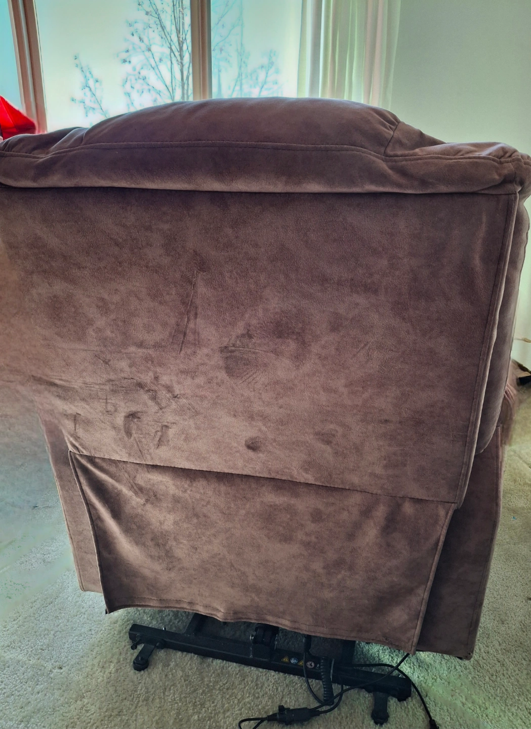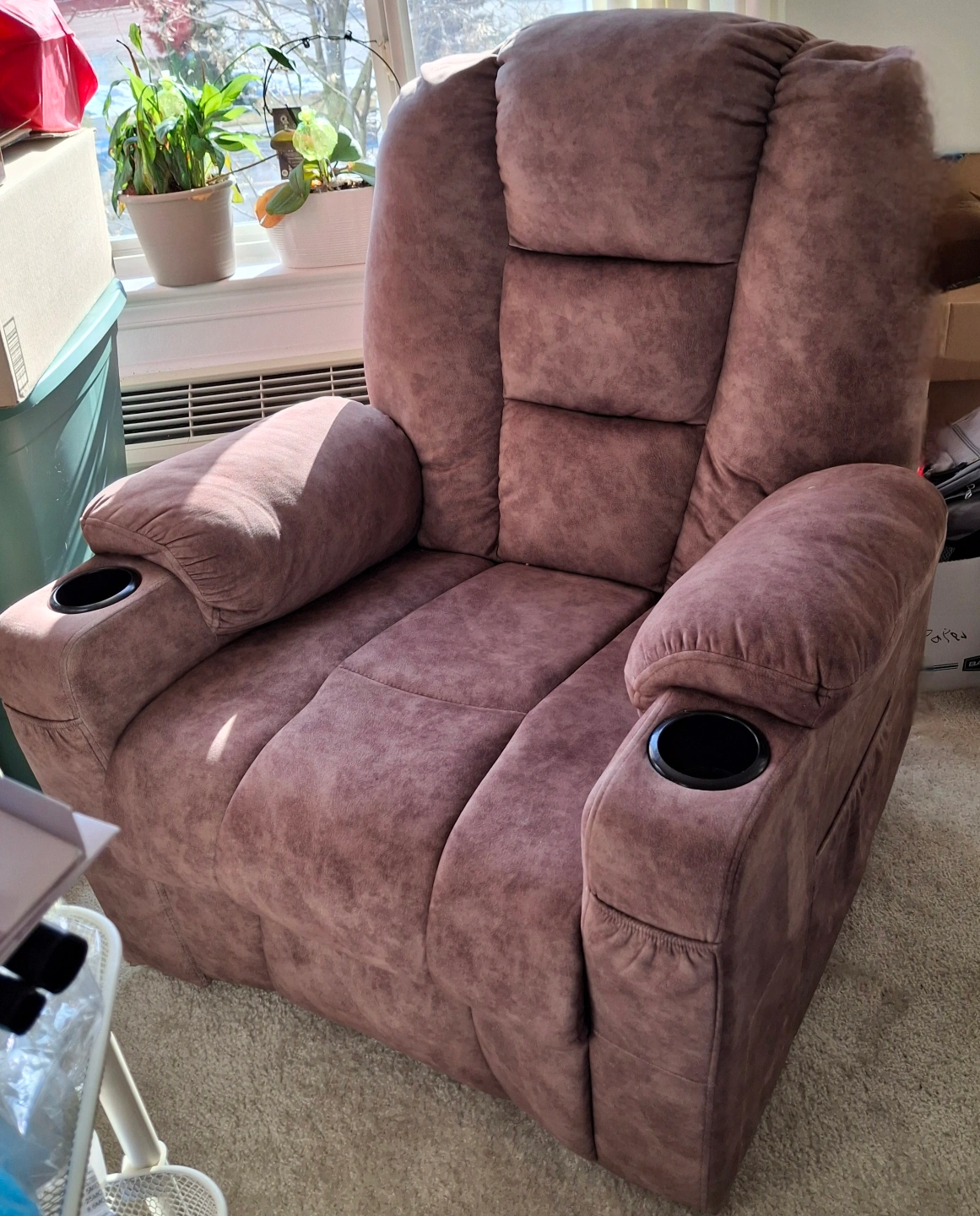 Brown power recliner. Features include cup holders and padded armrests. Minor wear visible. Has magazine pockets on each side and has heat and massage. If interested please call Christine at 905-865-8494 for directions. Accepting cash and e-transfer.