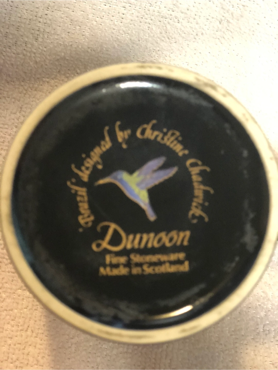 Fine stoneware mug. Black background. Features a hummingbird design in blue, gold and other colours. Designed by Christine Chatfield. Made in Scotland.