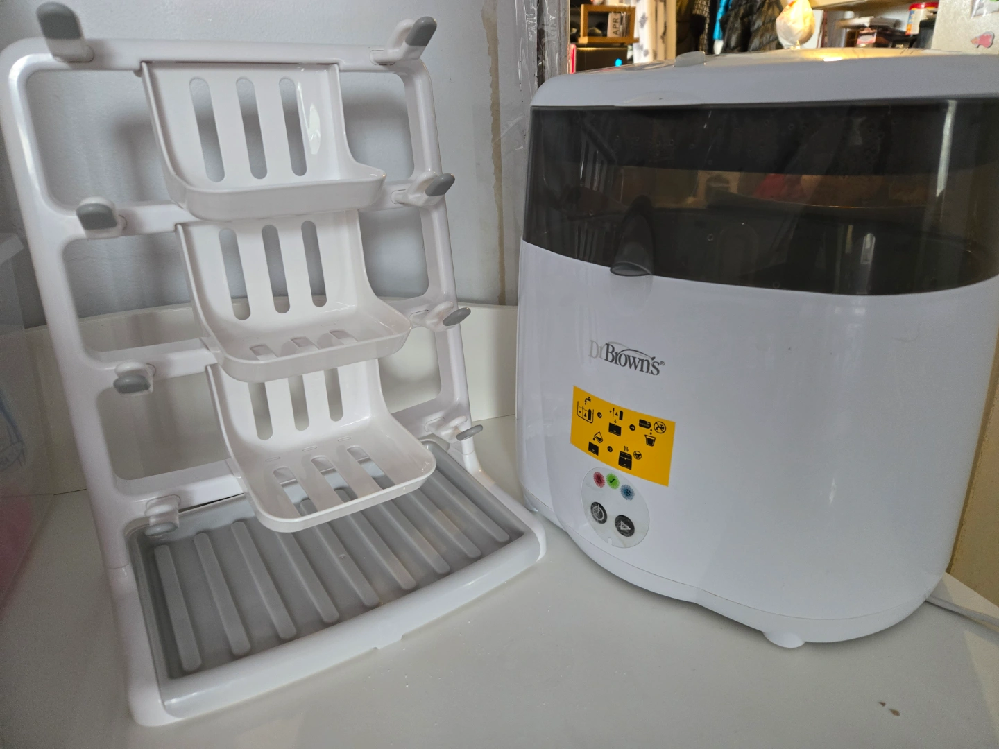 Dr Brown's bottle sterilizer and drying rack. Sterilizer features a large capacity and drying rack provides ample space for bottles and accessories. Convenient and efficient for baby bottle cleaning.