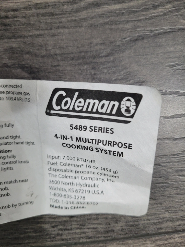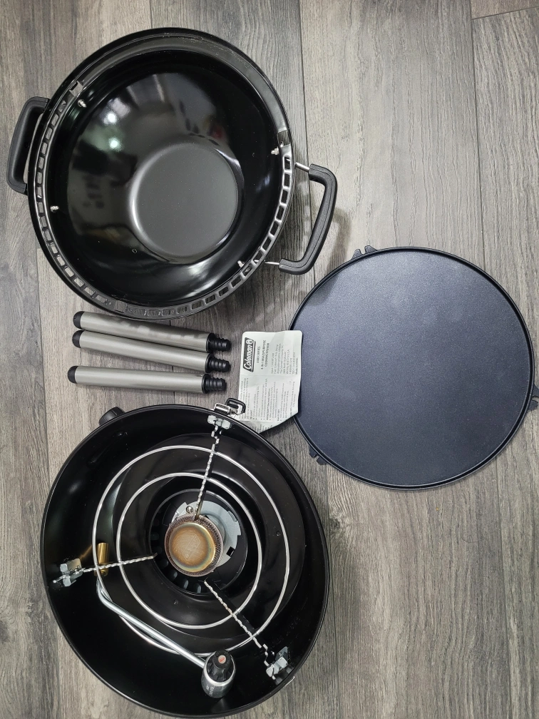 Coleman 4-in-1Portable propane stove. Includes grill, griddle and wok. Great for camping or small spaces. Three legs included.