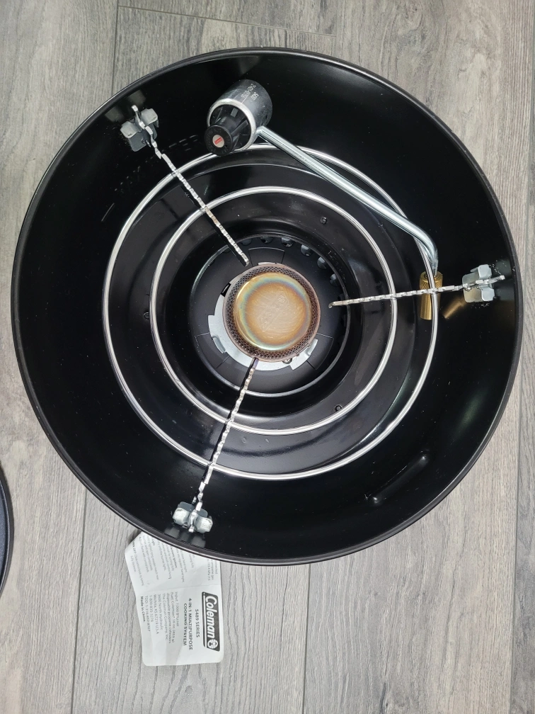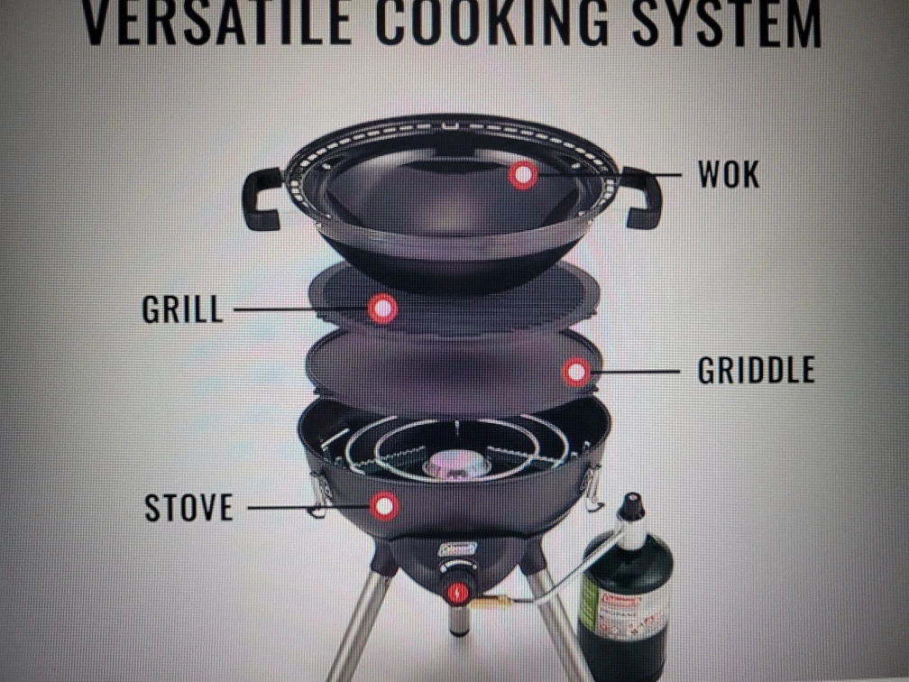 Coleman 4-in-1Portable propane stove. Includes grill, griddle and wok. Great for camping or small spaces. Three legs included.