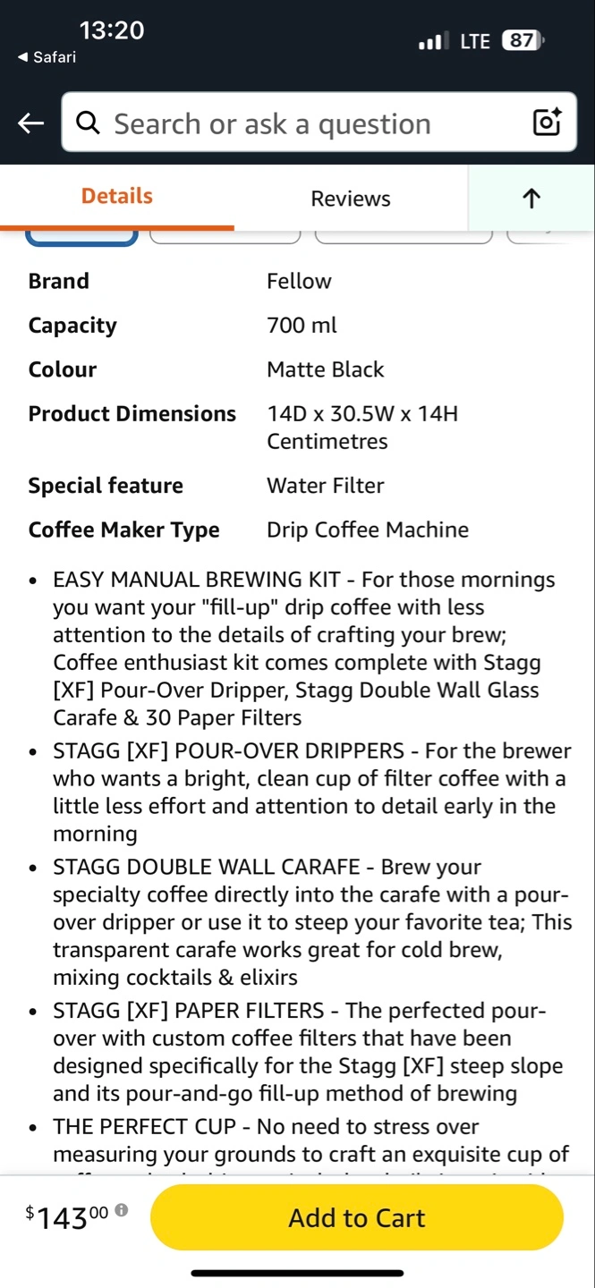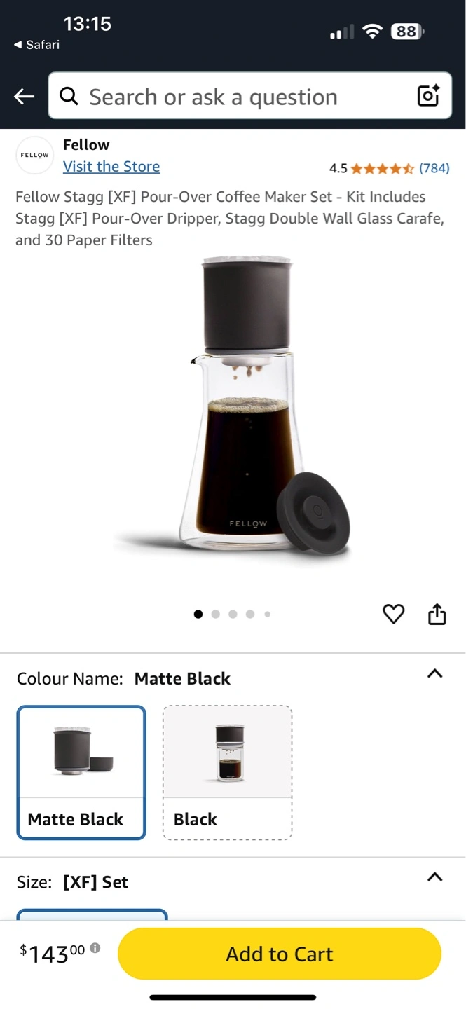 10Fellow Stag XF pour-over coffee dripper. Includes double-wall glass carafe and 30 paper filters. Matte black colour. 700ml capacity. Amazon retails for 143 before taxes Like new condition