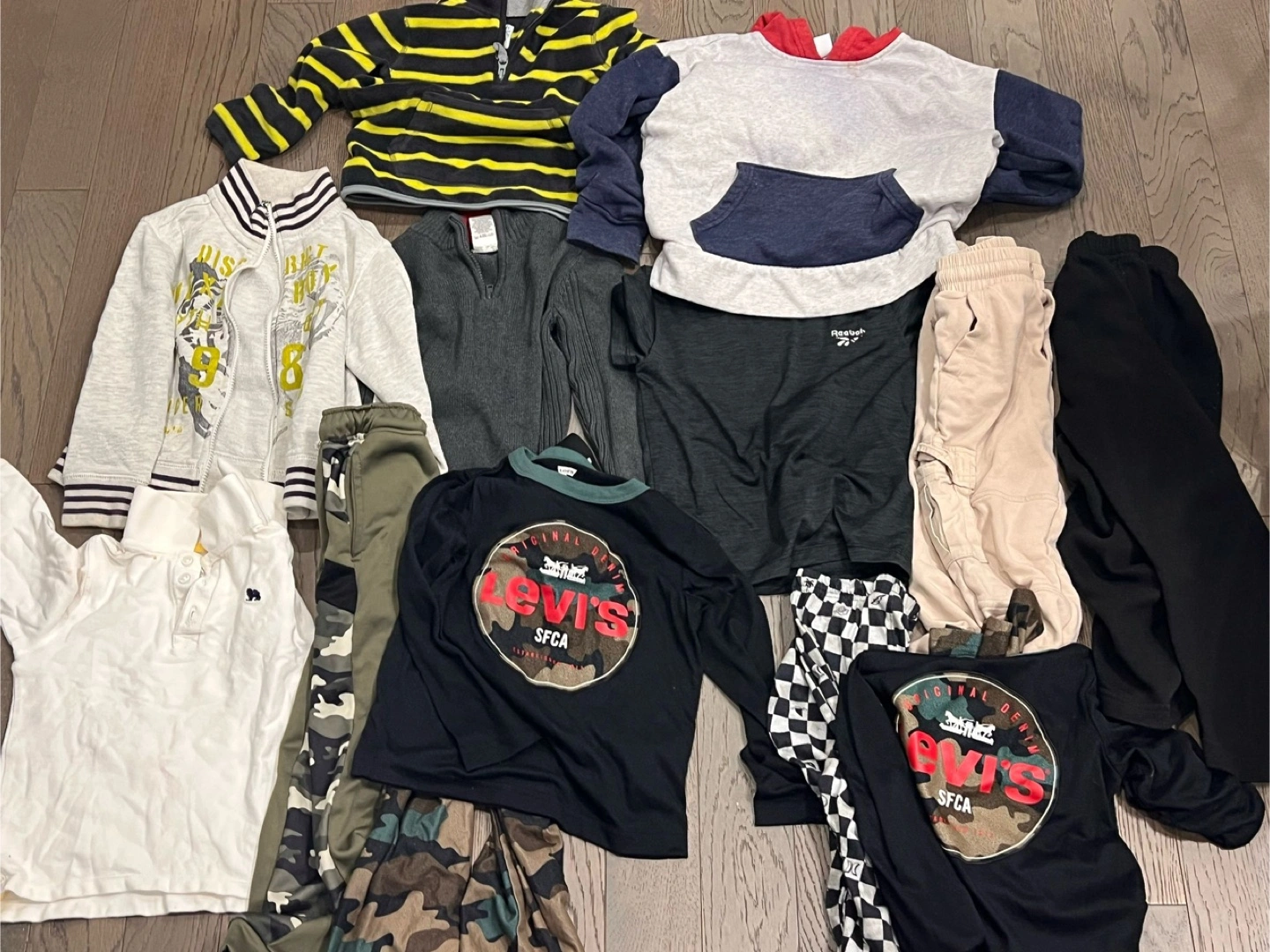 Large bundle of boys' clothing. Includes shirts, pants, hoodies, and more. Various colours and styles. Great for everyday wear. Sizes range from 4 to 6 years.