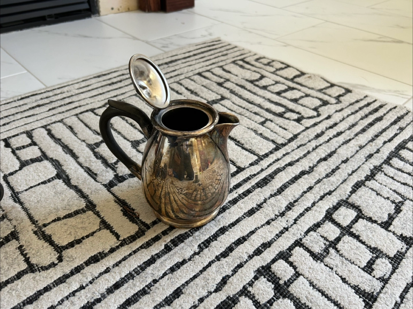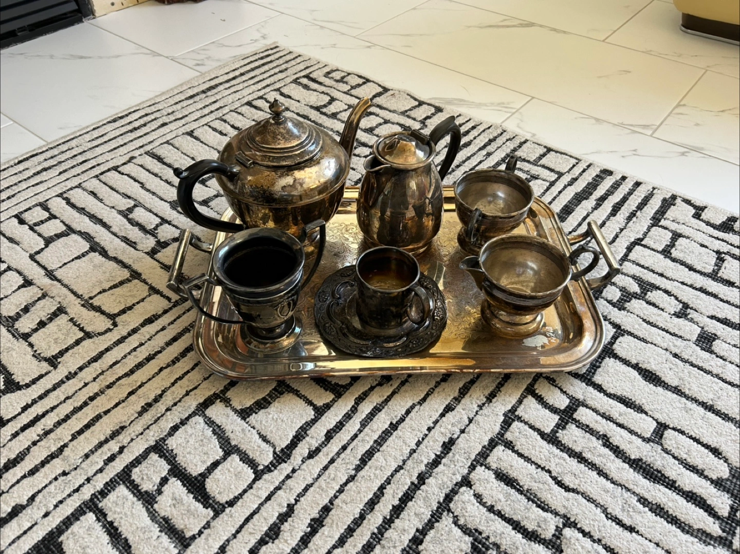Elegant vintage silverplate tea set. Includes teapot, creamer, sugar bowl, cups and saucer, and a serving tray. Shows some signs of age and wear. Perfect for collectors or vintage enthusiasts.