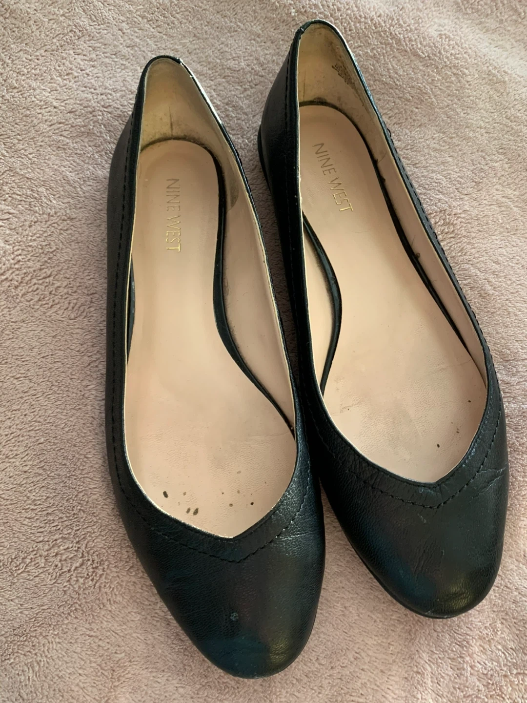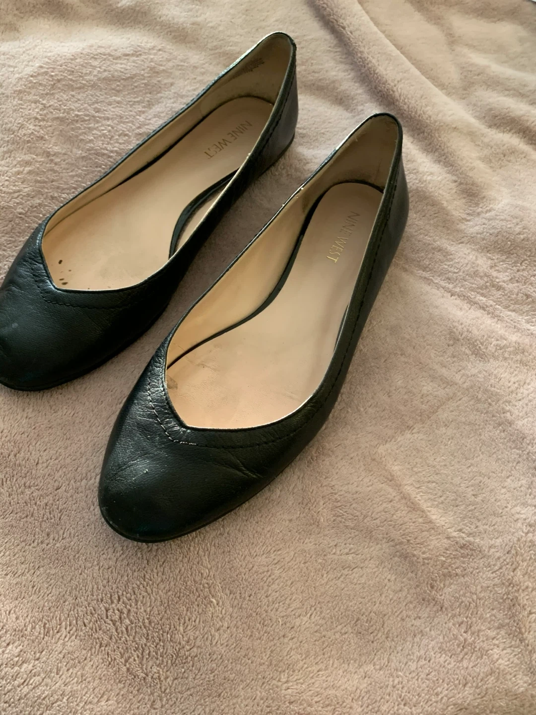 Women's black leather flats. Cut out v front. Decorative Stitching around the top edge. Pre-owned. A little scruffy inside by the label but otherwise in very good condition. Not worn much.