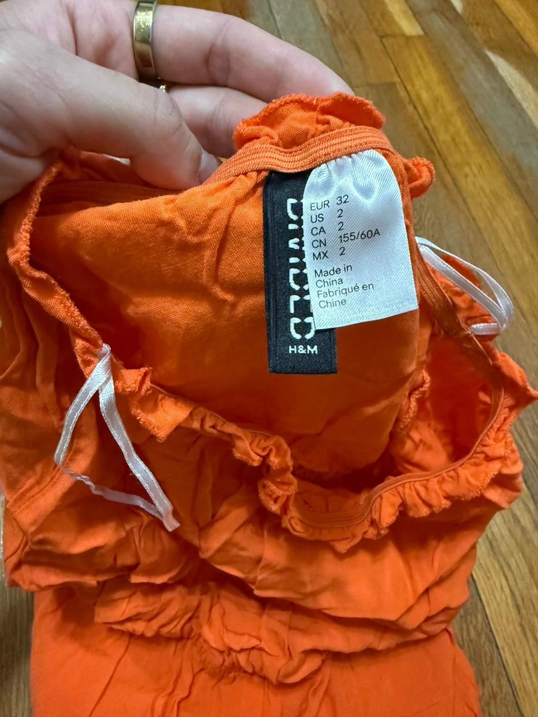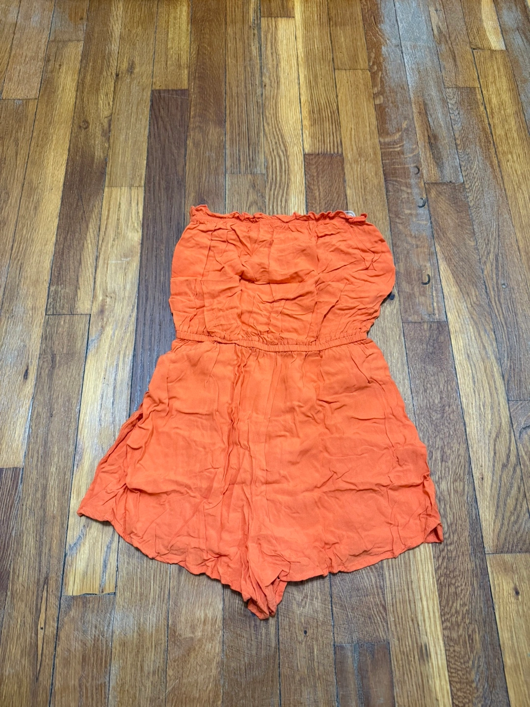 235Cute orange romper. Strapless with a ruffled neckline. Elastic waistband. Still in a good condition Pick up : Elmhurst, US Supermarket OR *Manhattan : 9 Avenue nearly subway (E train 50 st station ๐ ) Cash ๐ต
