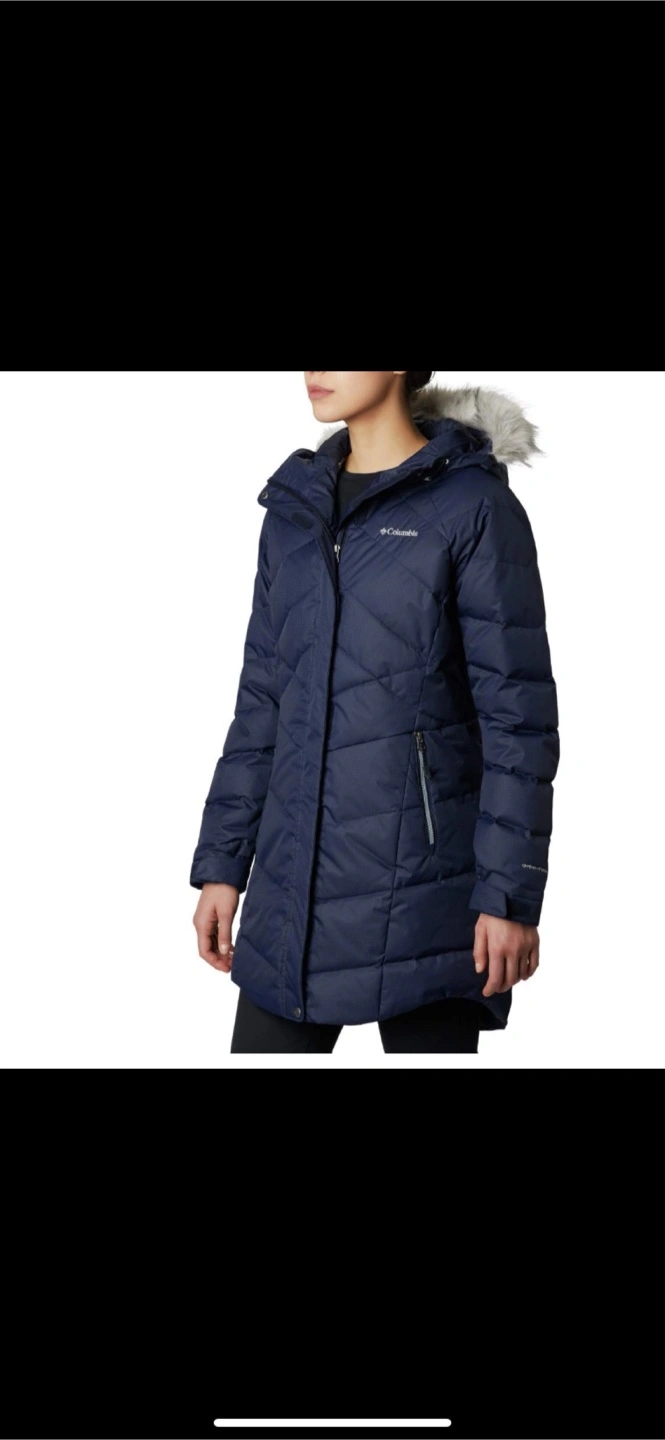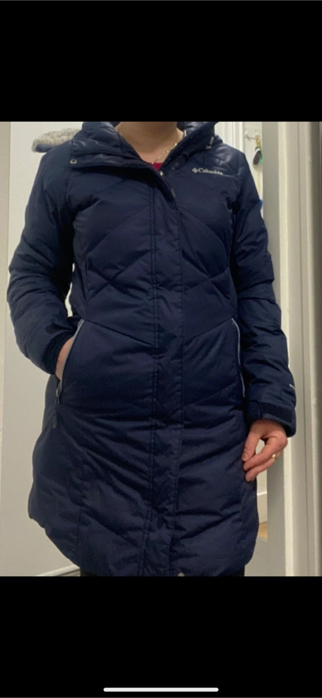 992Women's Columbia parka. Dark navy blue. Features a faux fur-trimmed hood and zipper closure. Long length. Excellent for winter weather.