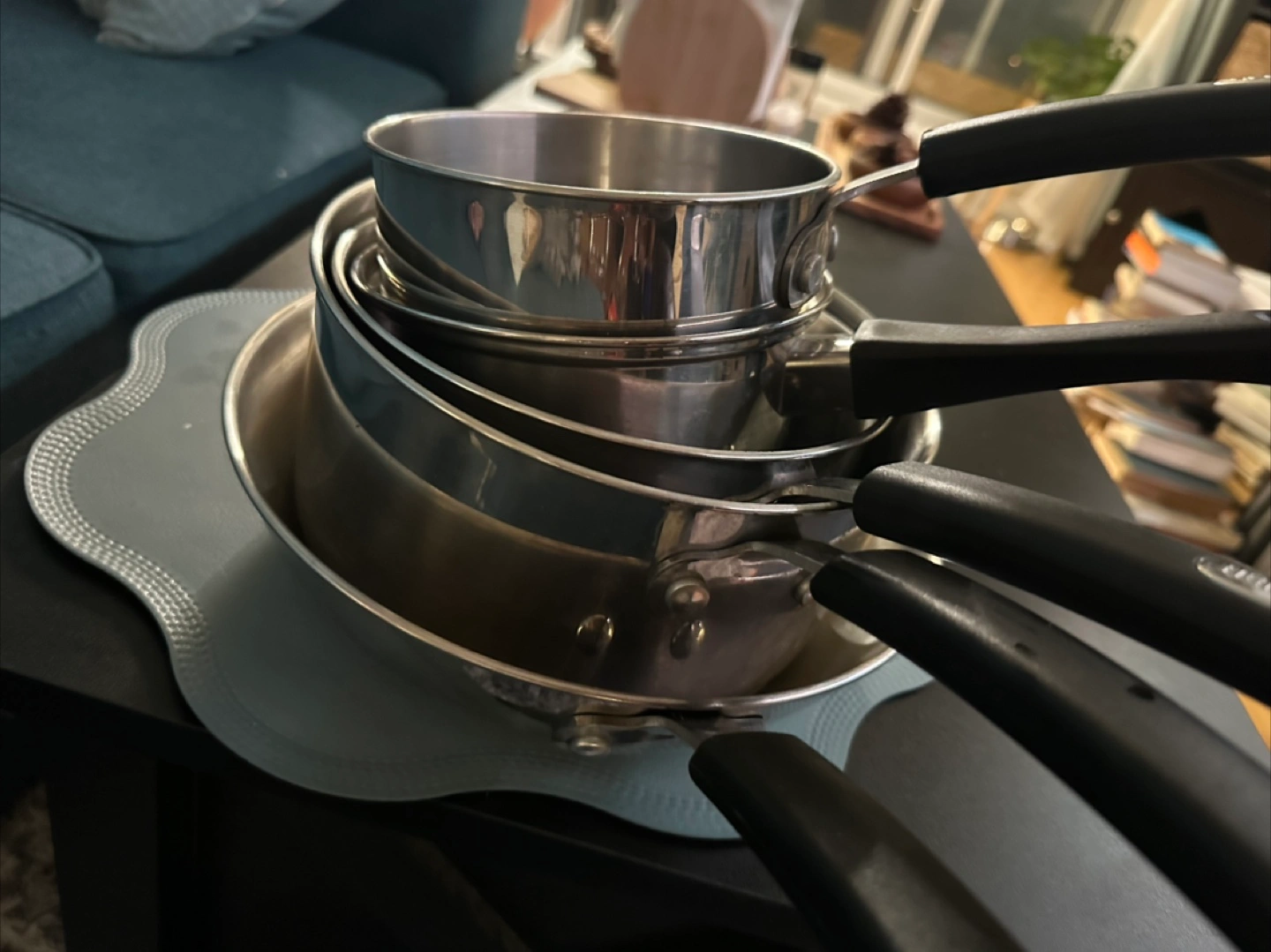 Bundle includes a set of stainless steel pots and pans, a colander, a wooden rolling pin, a set of plates, and a metal dish drying rack. Great for anyone who is starting from scratch all in good condition for use a bit more until you are ready to upgrade