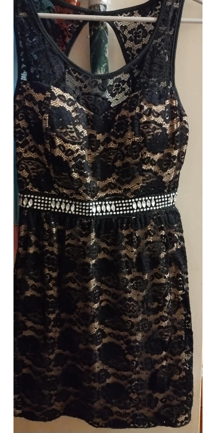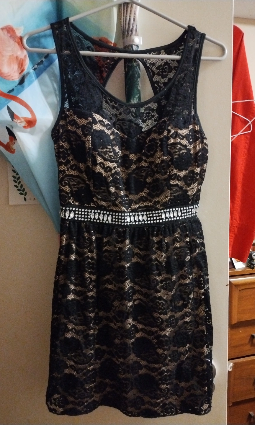 Beautiful sleeveless black and beige lace dress. Features a keyhole back and a rhinestone belt. Perfect for a special occasion. Missing one stone on side of belt but barely noticeable, otherwise in perfect condition. Cash only. Meet at Bridlewood Mall but willing to meet elsewhere if you spend $20 or more on items.