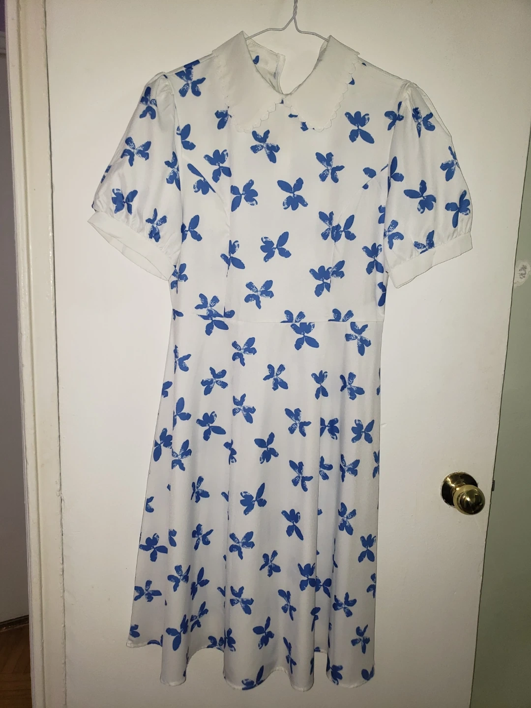 Adorable summer dress. Features a Peter Pan collar, short sleeves, and a flattering A-line silhouette. Blue floral pattern on white background. Great for warm weather.