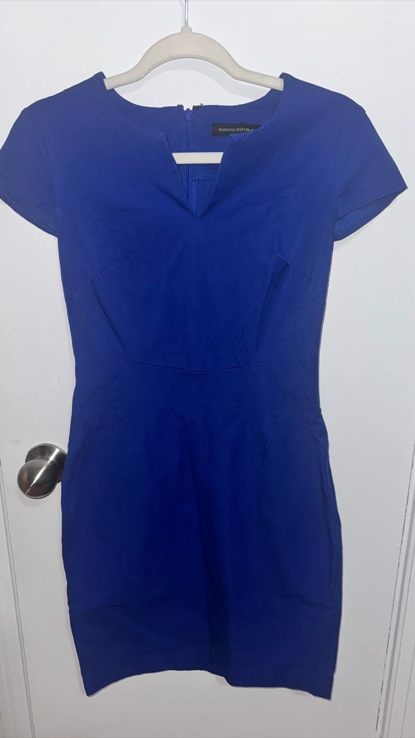 113Stunning royal blue sheath dress. Short sleeves, V-neck. Form-fitting silhouette. Perfect for work or a night out.