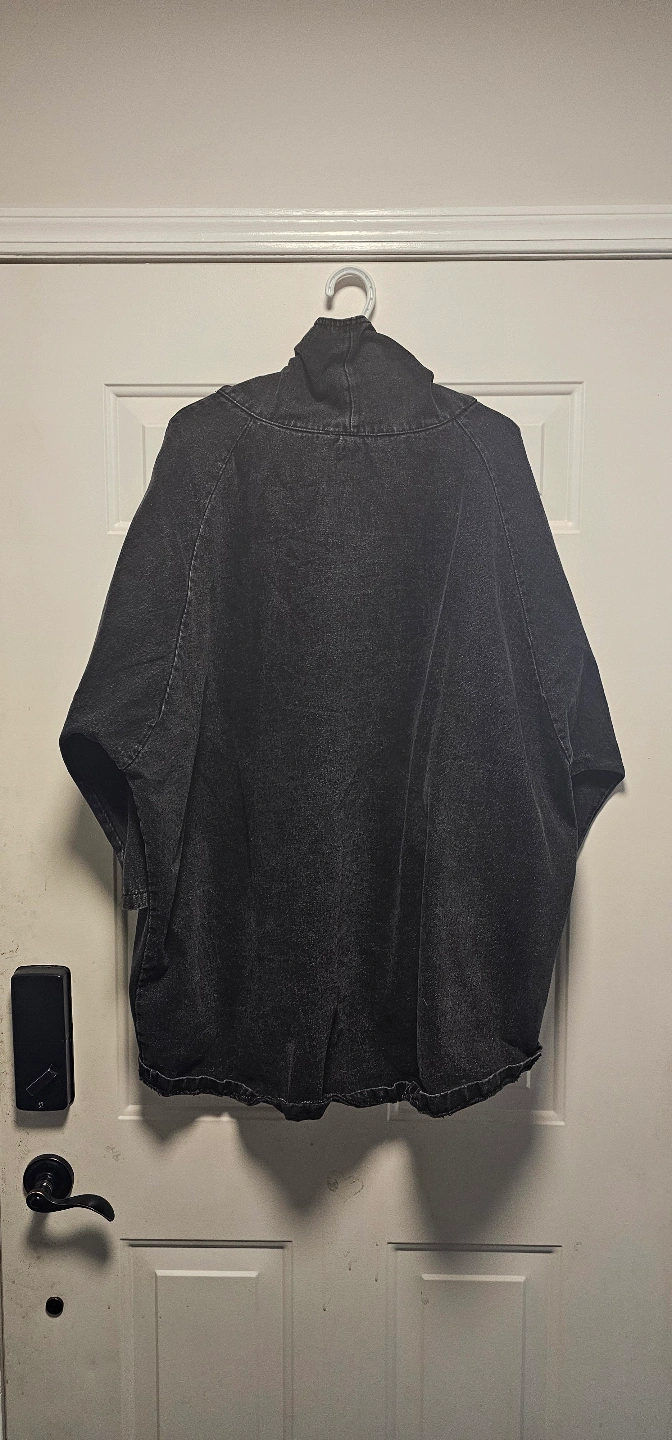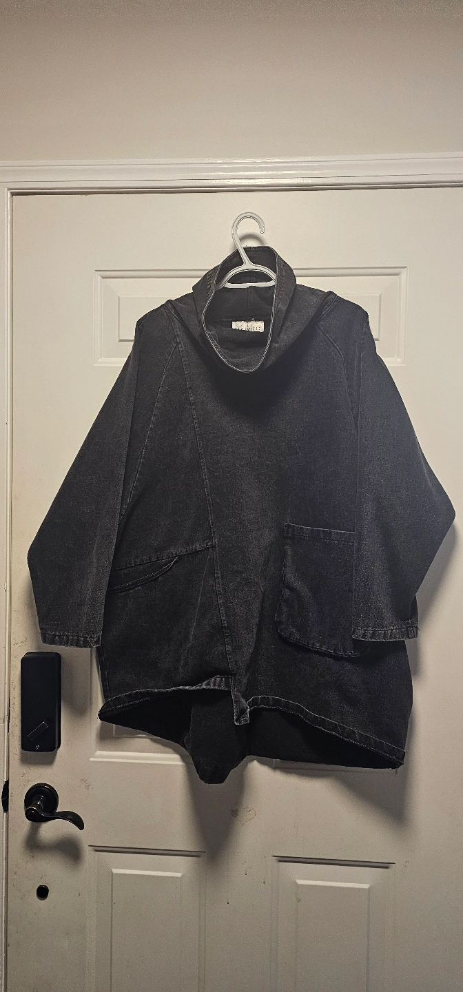 Black denim top. Relaxed fit. High neck. Small front pocket. Unique design. 2 front convenient pockets.