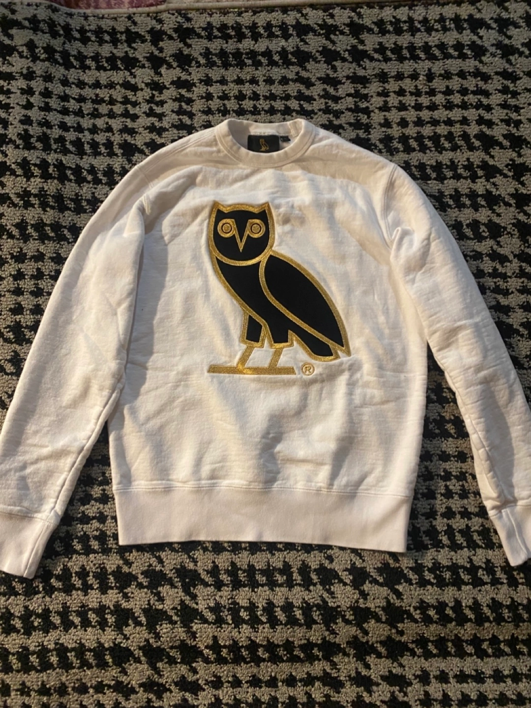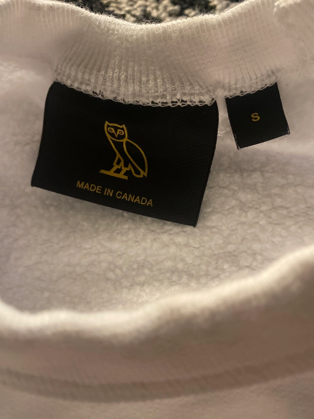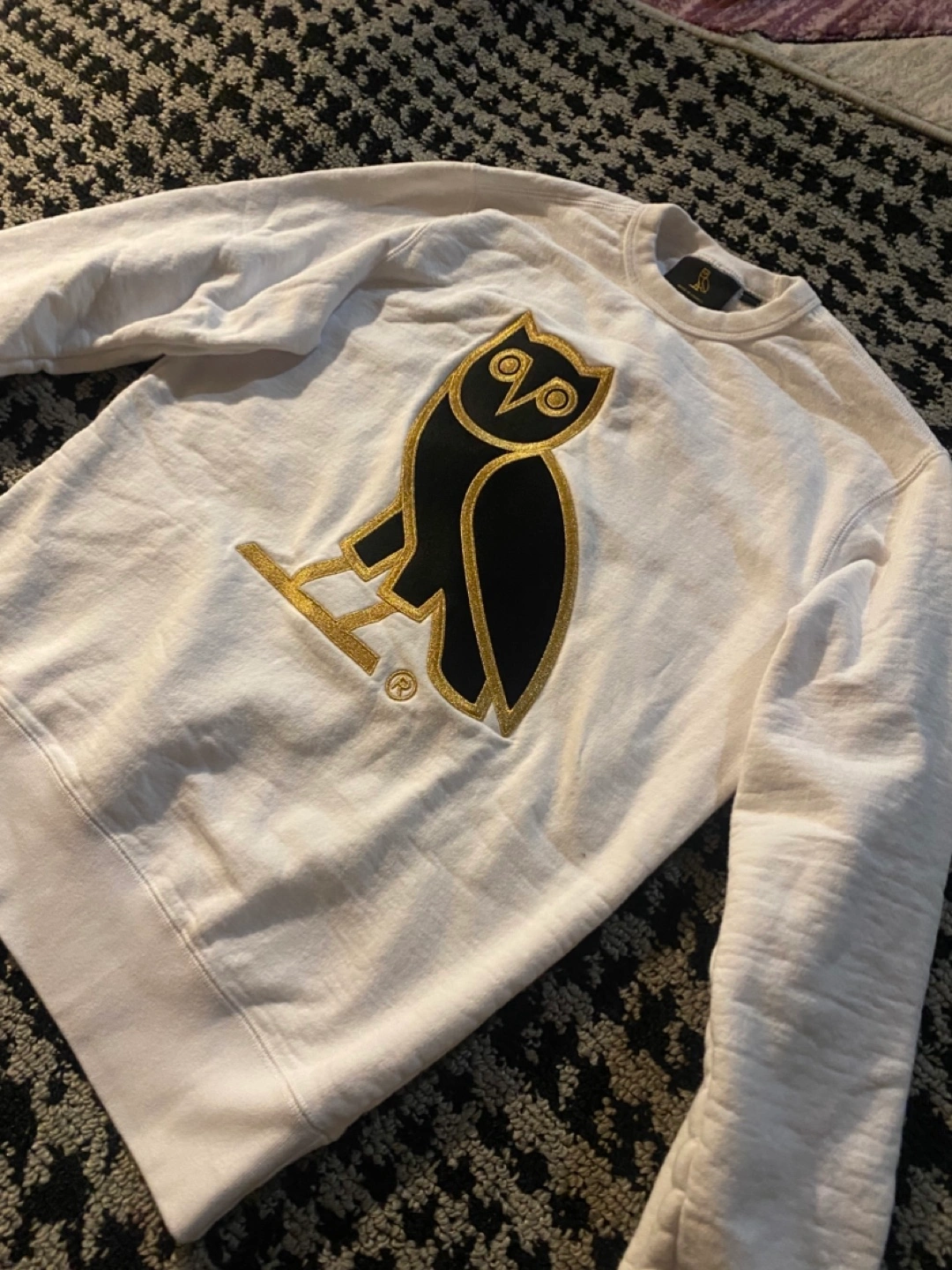 White OVO crewneck sweatshirt. Features a large black and gold owl logo on the front. Made in Canada. Size small.