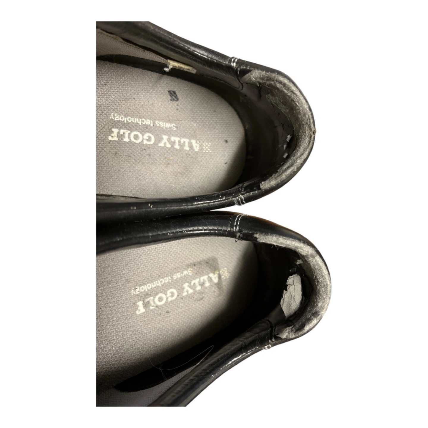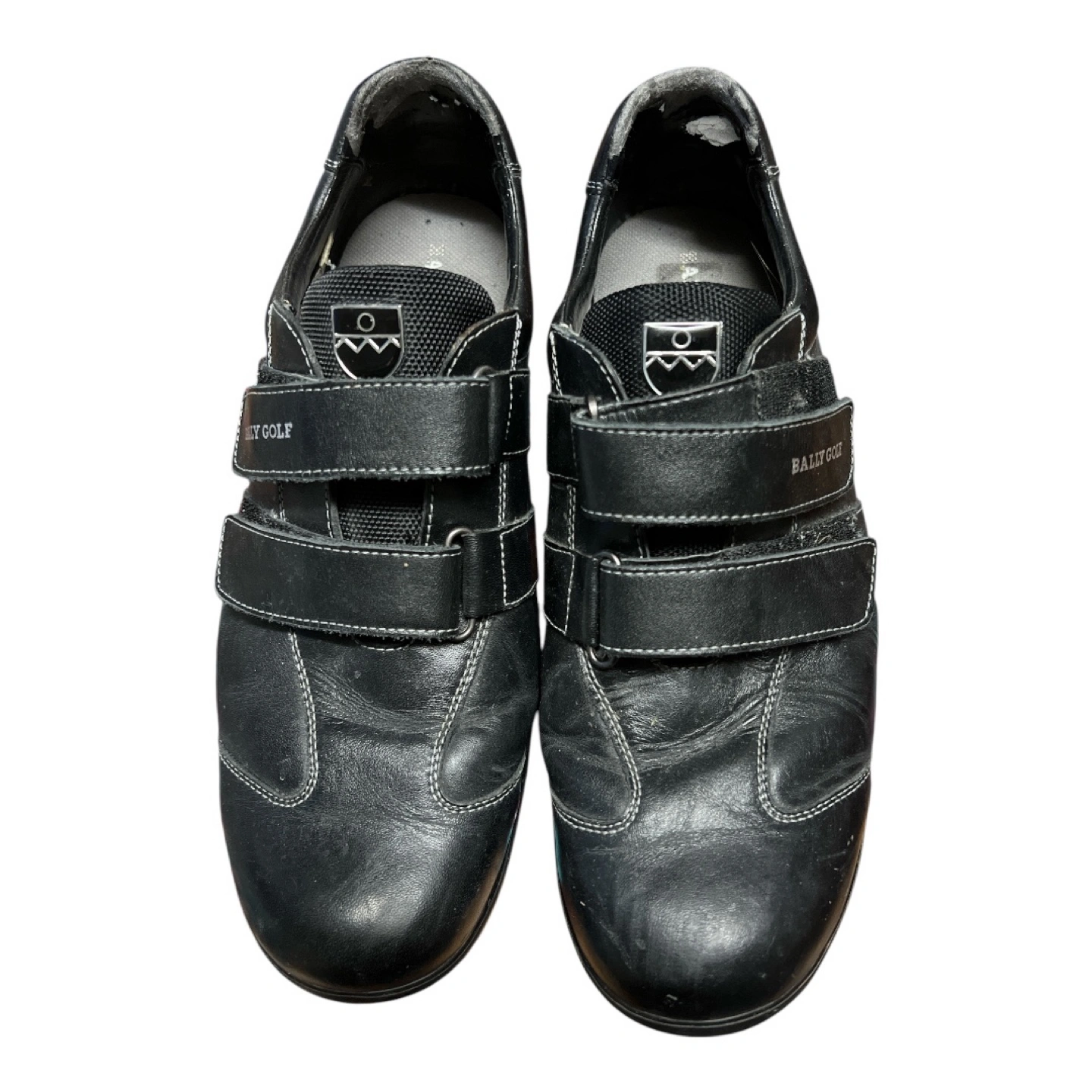 Pre-owned Bally Golf shoes. Black leather. Velcro closures. Some wear and tear. Swiss Technology. Size 10.5.