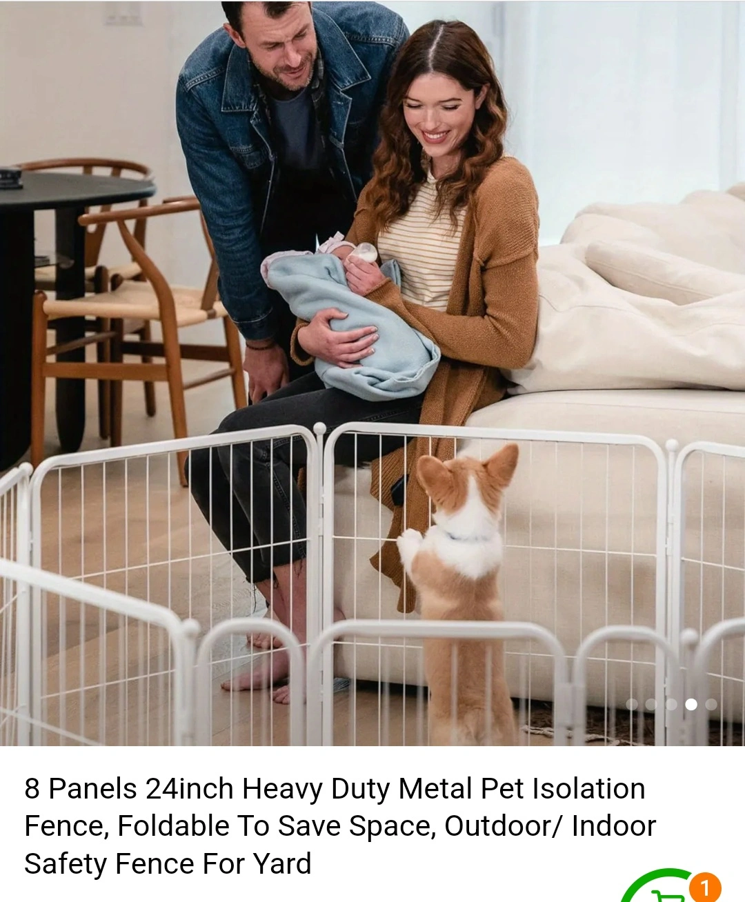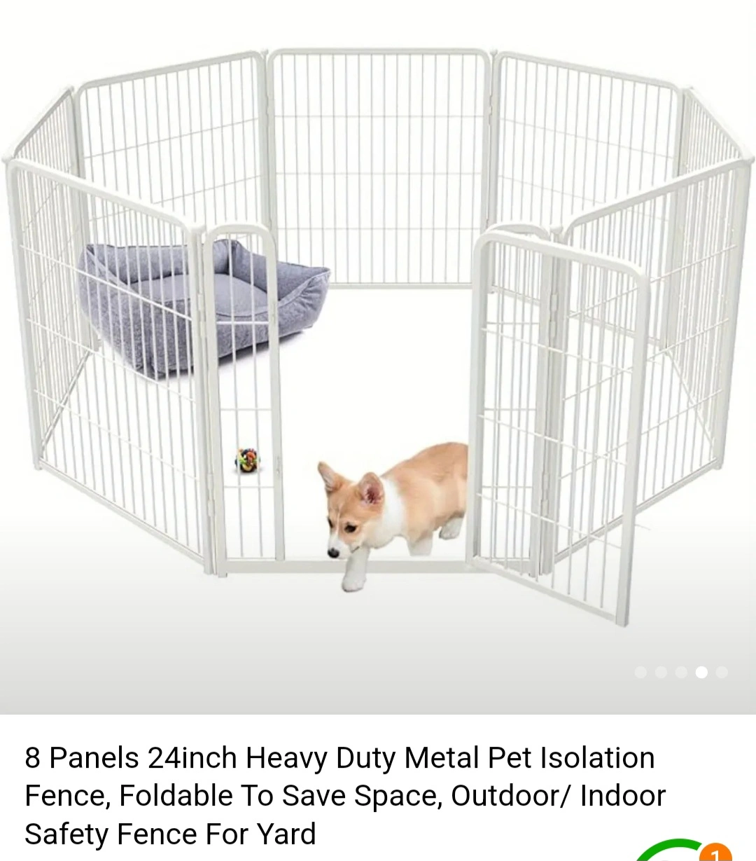 Foldable pet pen. Eight panels. 24-inch height. Metal construction. Indoor/outdoor use. Safety features include smooth edges and secure latch. best thing I've owned for blocking dog or kids from places you dont want them to go, super easy to assemble, in great condition selling because we rehomed our dog. i try to find excuses to keep it because it was the best gate I ever bought, but I don't use it.