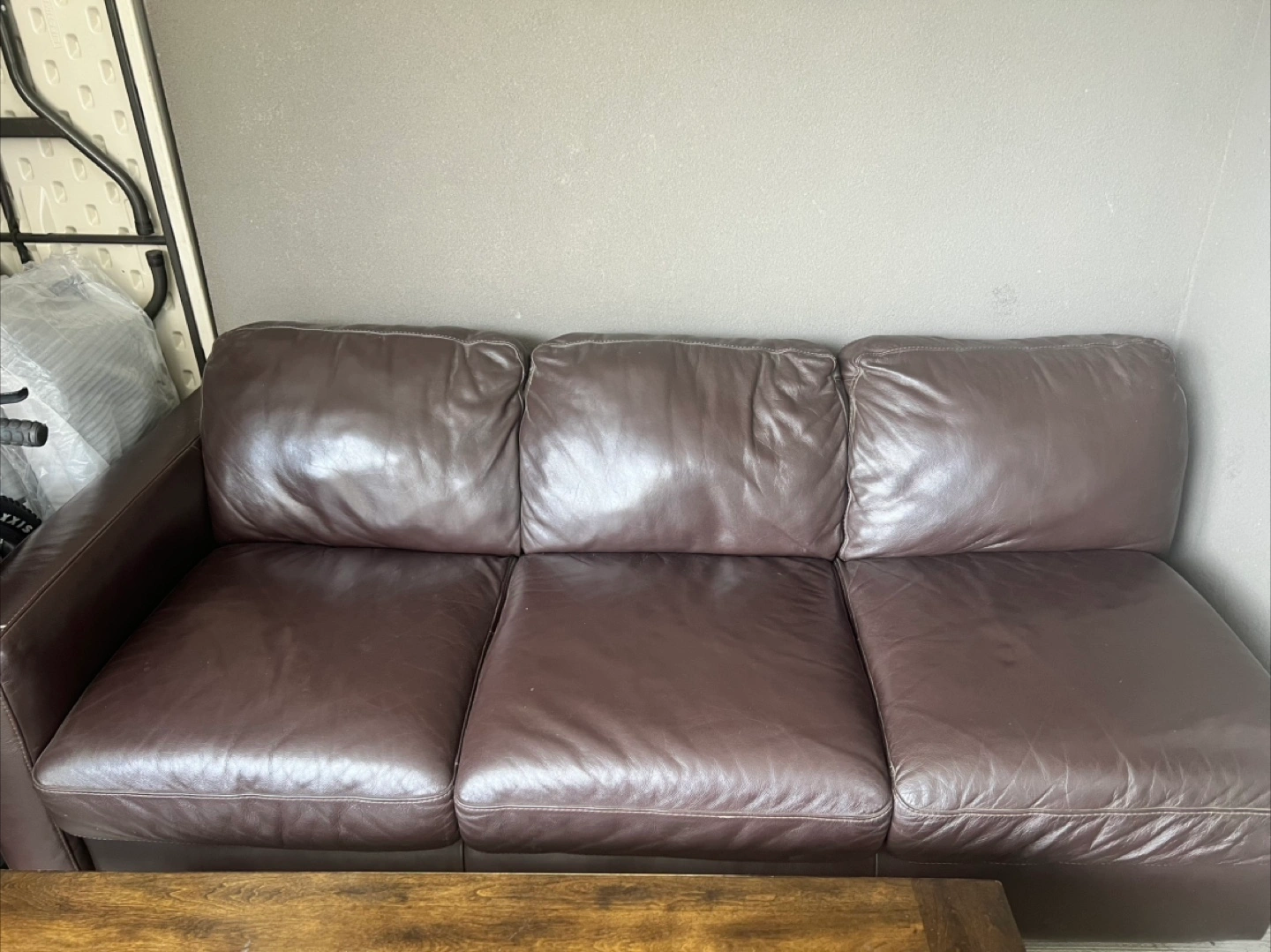 Comfortable and stylish 3-seater brown leather sofa in good used condition. No damage or tears. Perfect for a living room, basement, or office space.