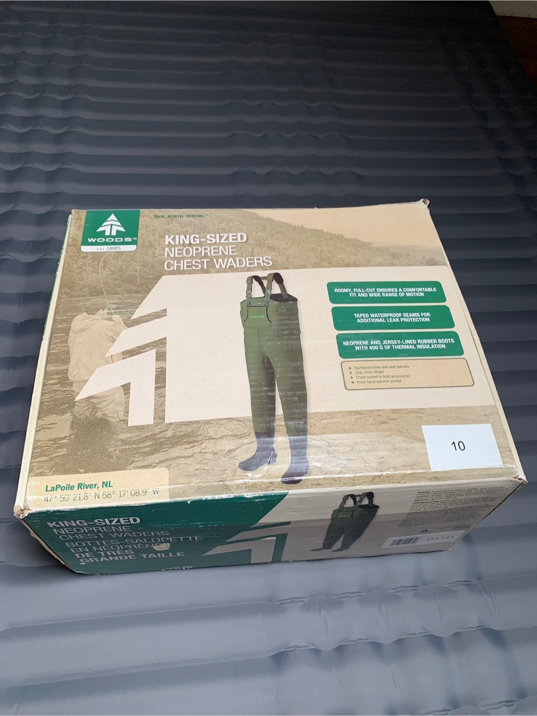 New, never used in box. Neoprene chest waders. Size 10. Includes boots and carrying strap. Green colour.
