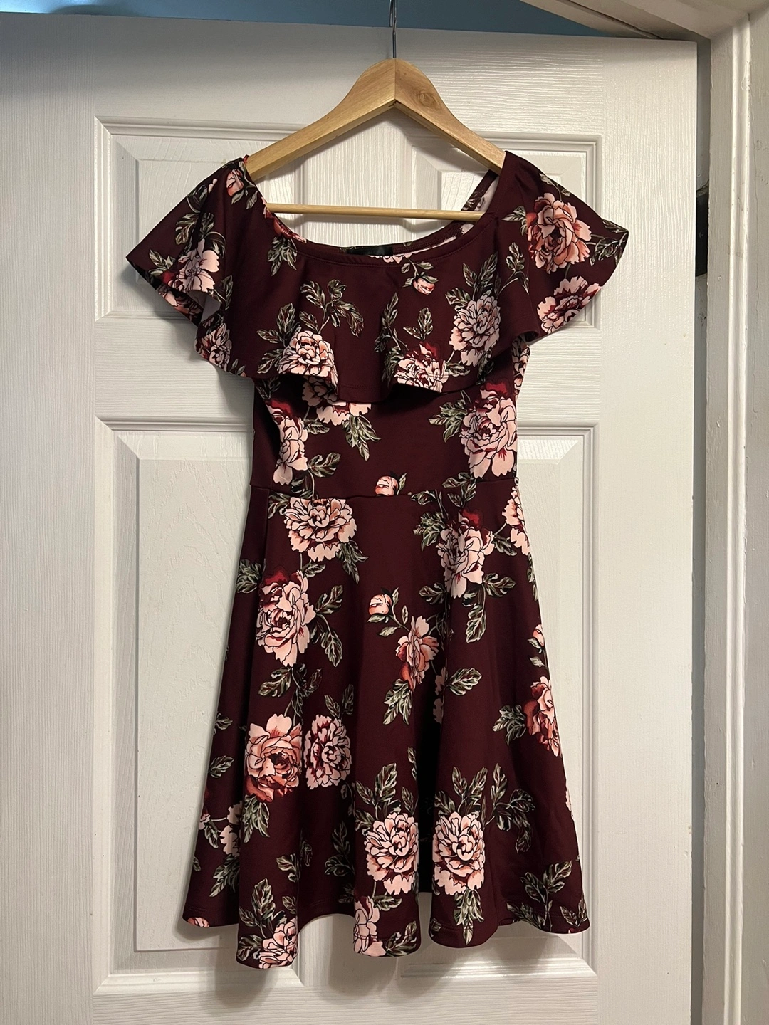 374Cute burgundy dress. Features off-the-shoulder ruffled neckline and a floral print. Perfect for a casual outing or special occasion. $10.. Check out my other dresses..
