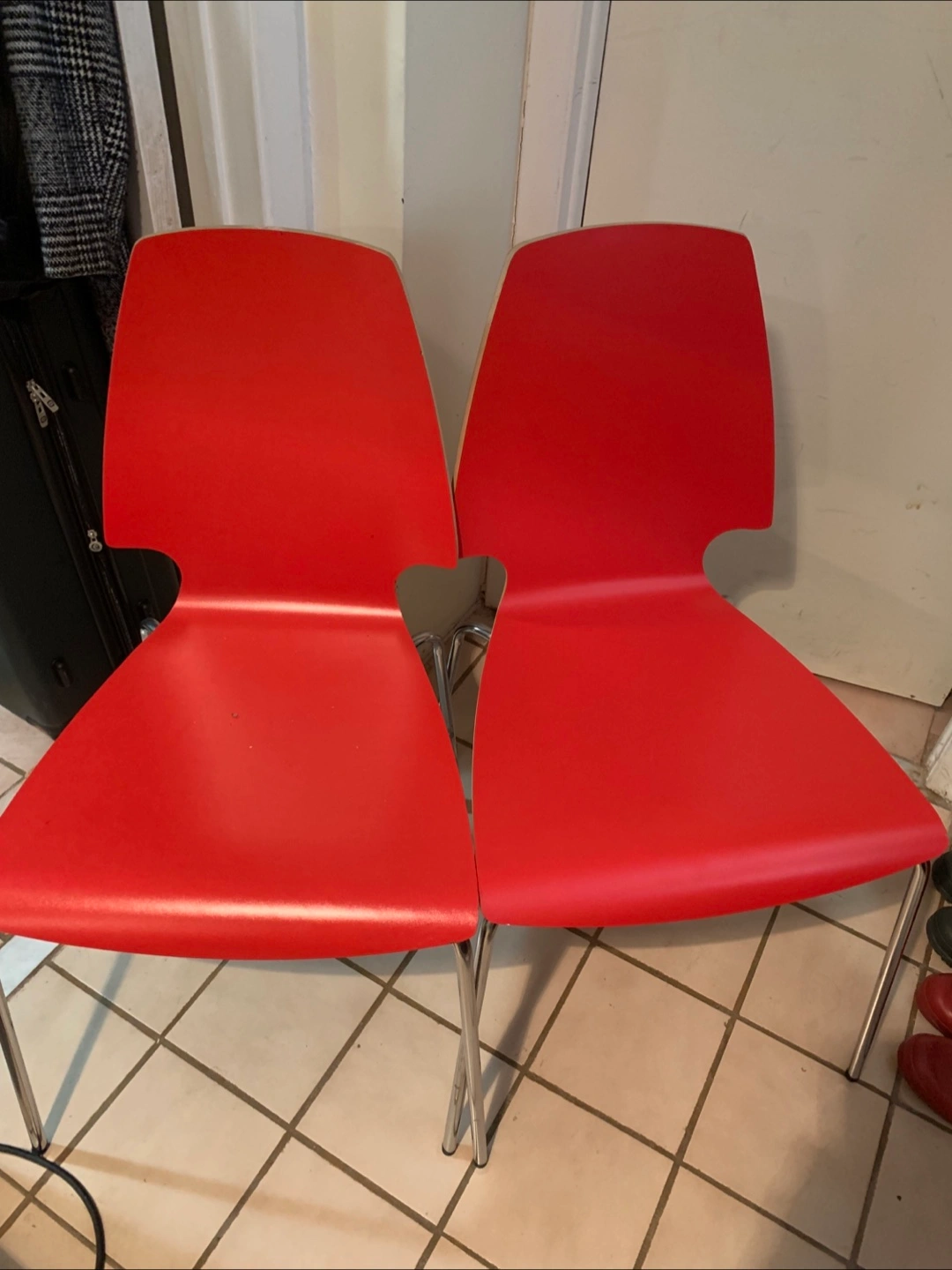 Two red wood chairs with chrome legs. Simple design, good for a kitchen or dining room. Some minor wear and tear.