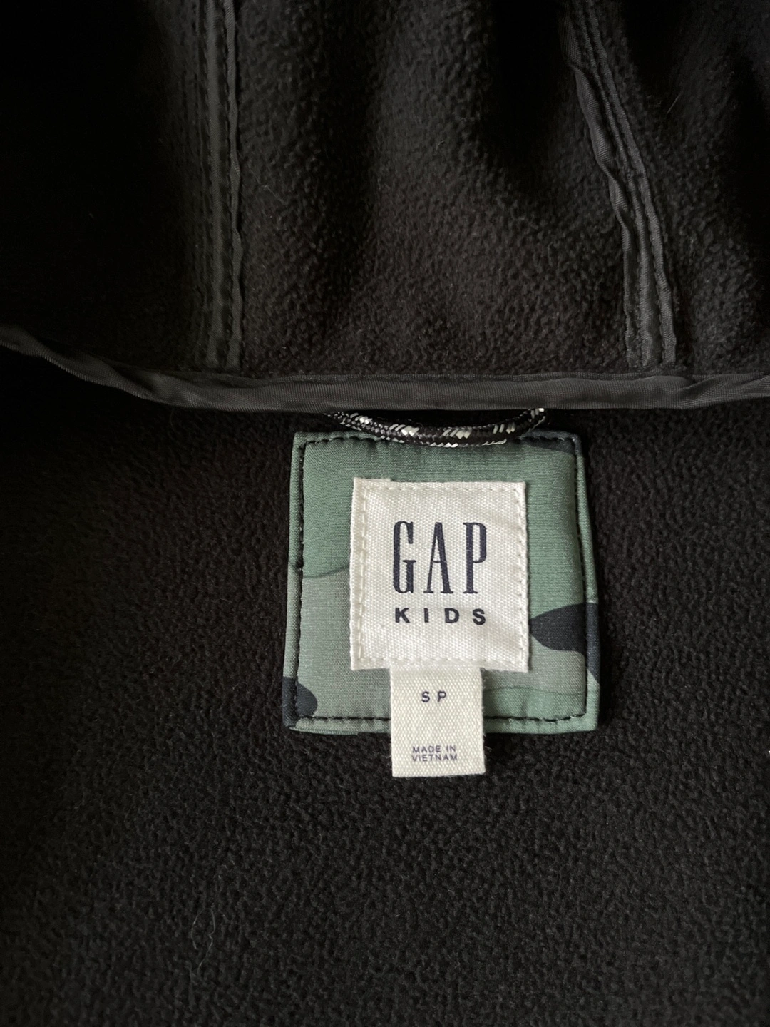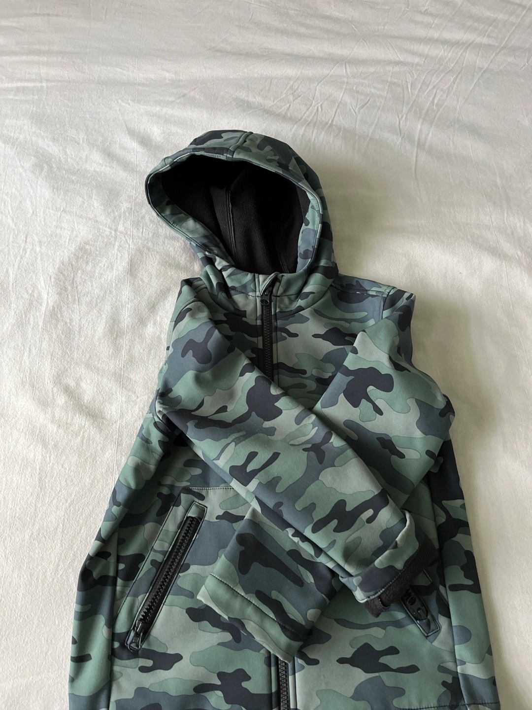 Camouflage print softshell jacket. Features a zip front closure, hood, and two zippered pockets. Soft fleece lining. Never worn.